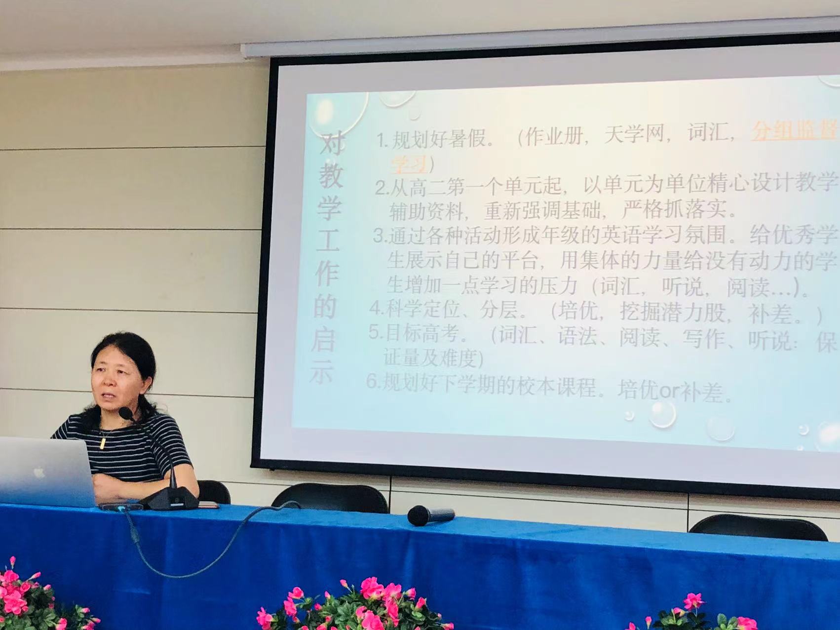首先,年级组长程瑞芬老师对高一年级的期末考试情况进行整体介绍。程老师利用平台数据,从上线情况、平均分、各层次学生等角度分析考试状况,反思前一阶段教学目标的完成情况,在总结经验、查找问题、确定措施的基础上明确新学年教学目标与方向,明确暑期的学生管理措施。程老师还分享了高一年级组在习惯培养上的具体做法,总结了高一年级一学年的习惯培养成果。