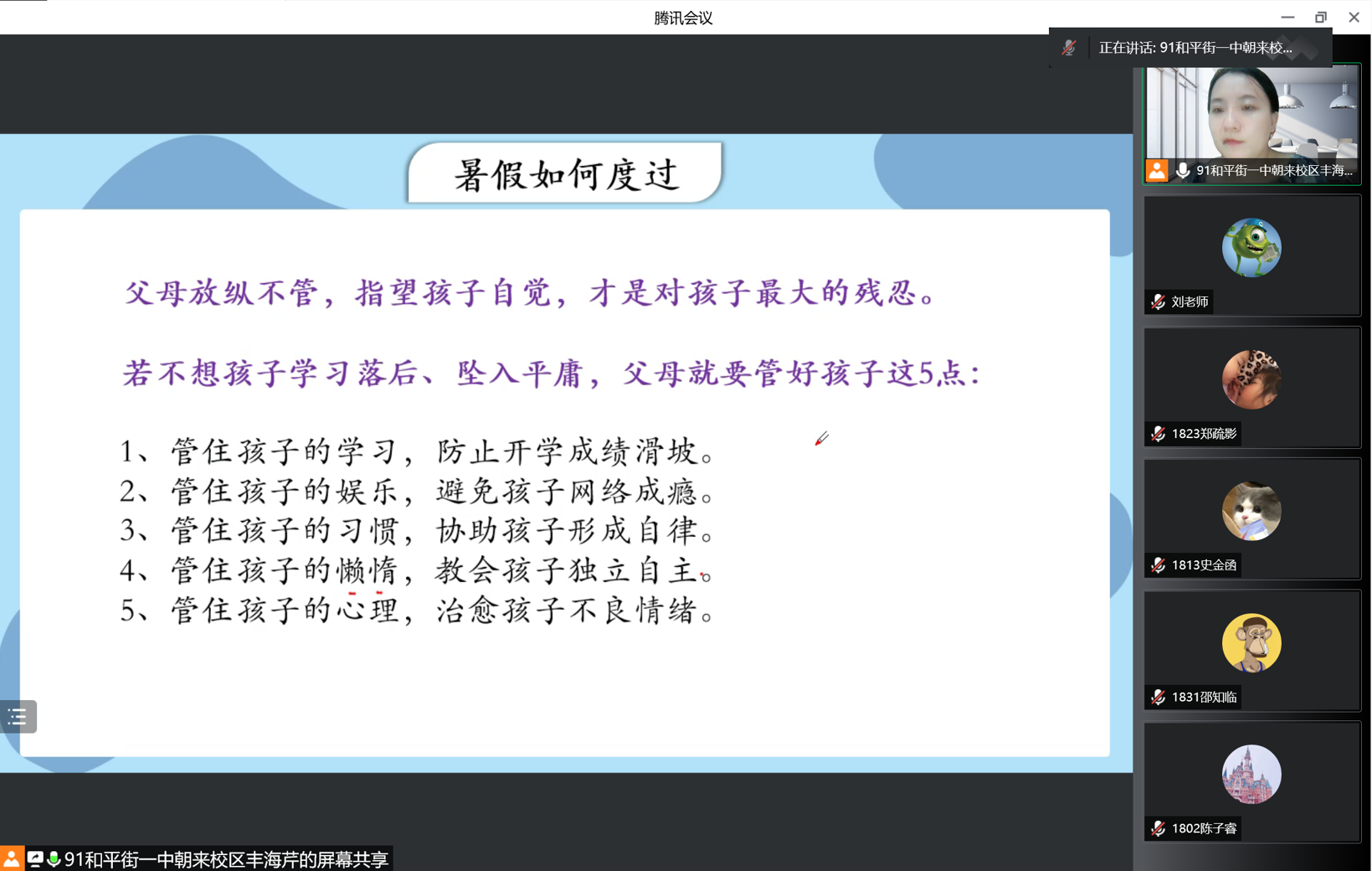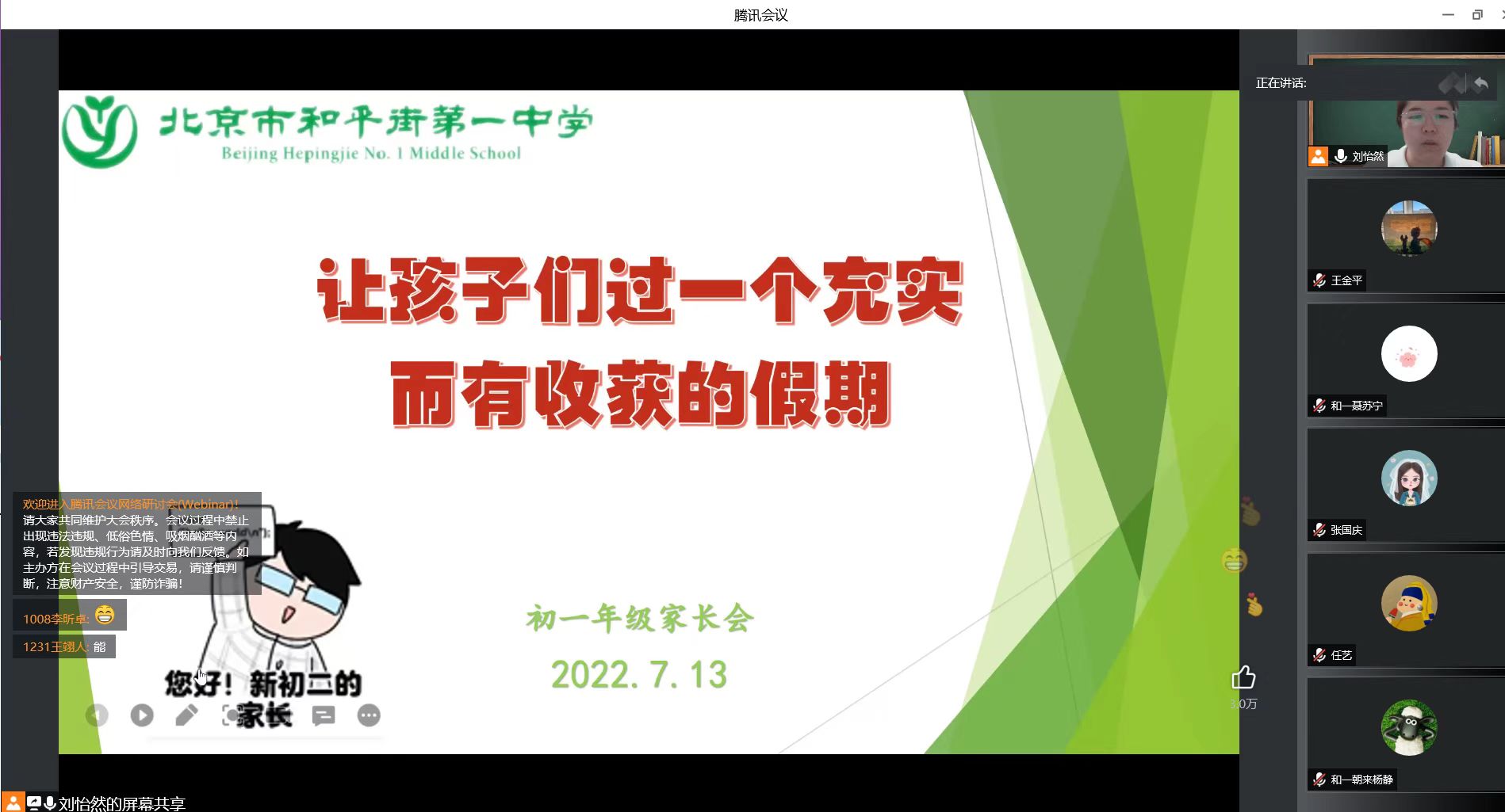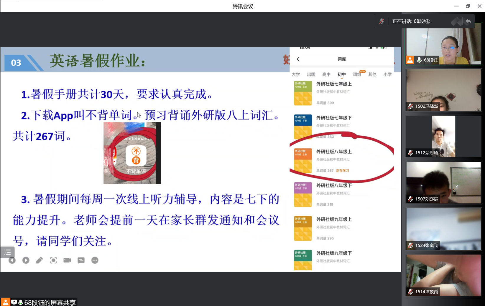 会议第二阶段在各班腾讯会议室召开,会议由各班班主任主持,班主任就班级特色以及本学期学生的学习情况进行交流,各科老师针对不同类型孩子的核心特点,提出了暑期的学科学习建议,帮助家长从孩子的角度出发给孩子更切实的帮助,制定详尽的计划让孩子的生活有规律,督促孩子认真完成假期作业,为迈向初二年级做好准备。