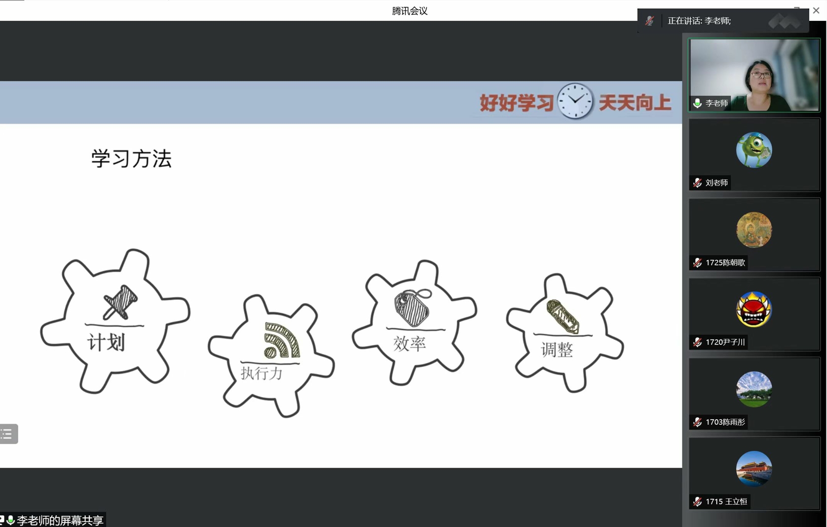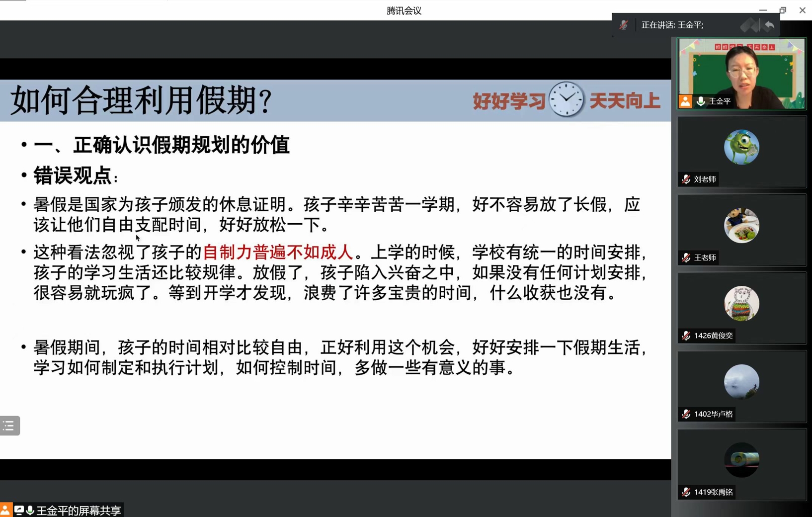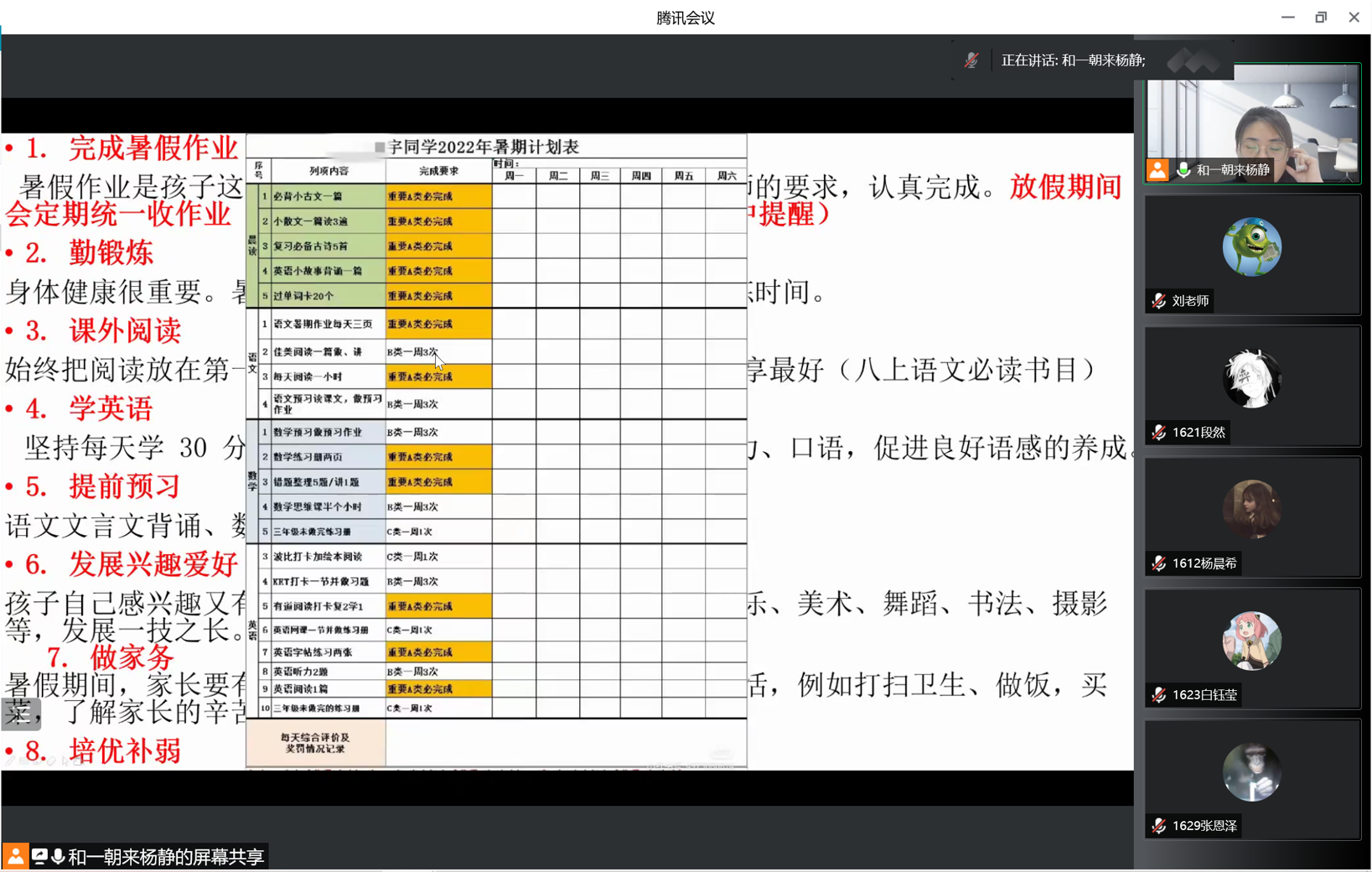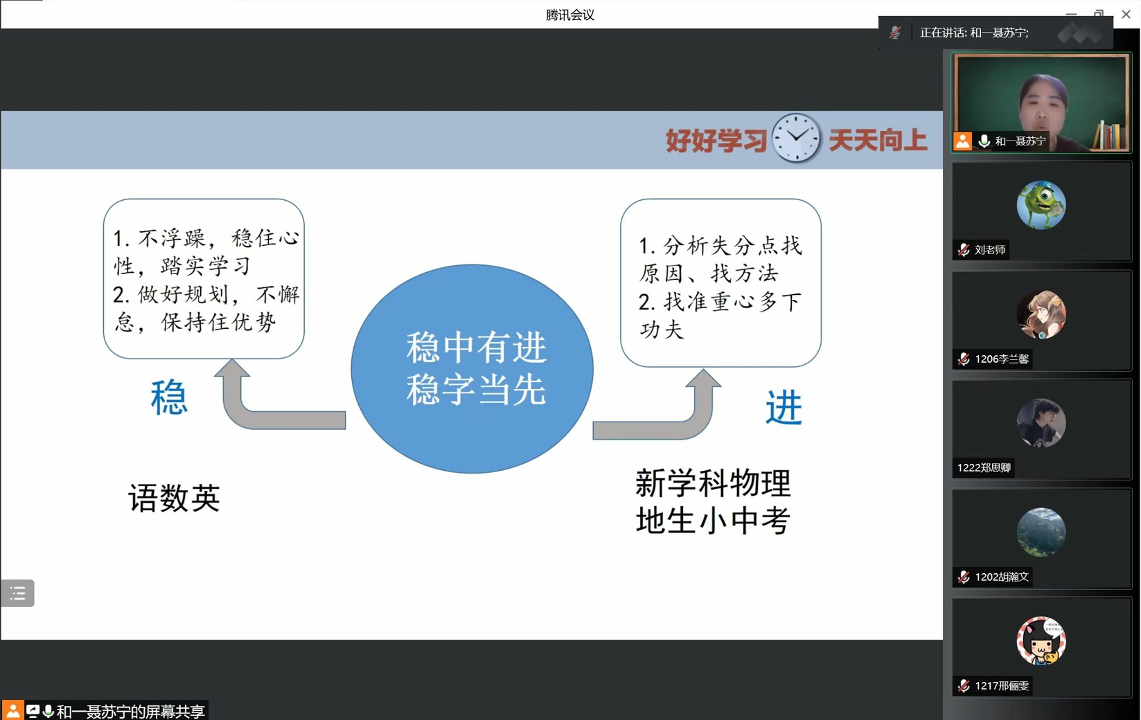 会议第二阶段在各班腾讯会议室召开,会议由各班班主任主持,班主任就班级特色以及本学期学生的学习情况进行交流,各科老师针对不同类型孩子的核心特点,提出了暑期的学科学习建议,帮助家长从孩子的角度出发给孩子更切实的帮助,制定详尽的计划让孩子的生活有规律,督促孩子认真完成假期作业,为迈向初二年级做好准备。