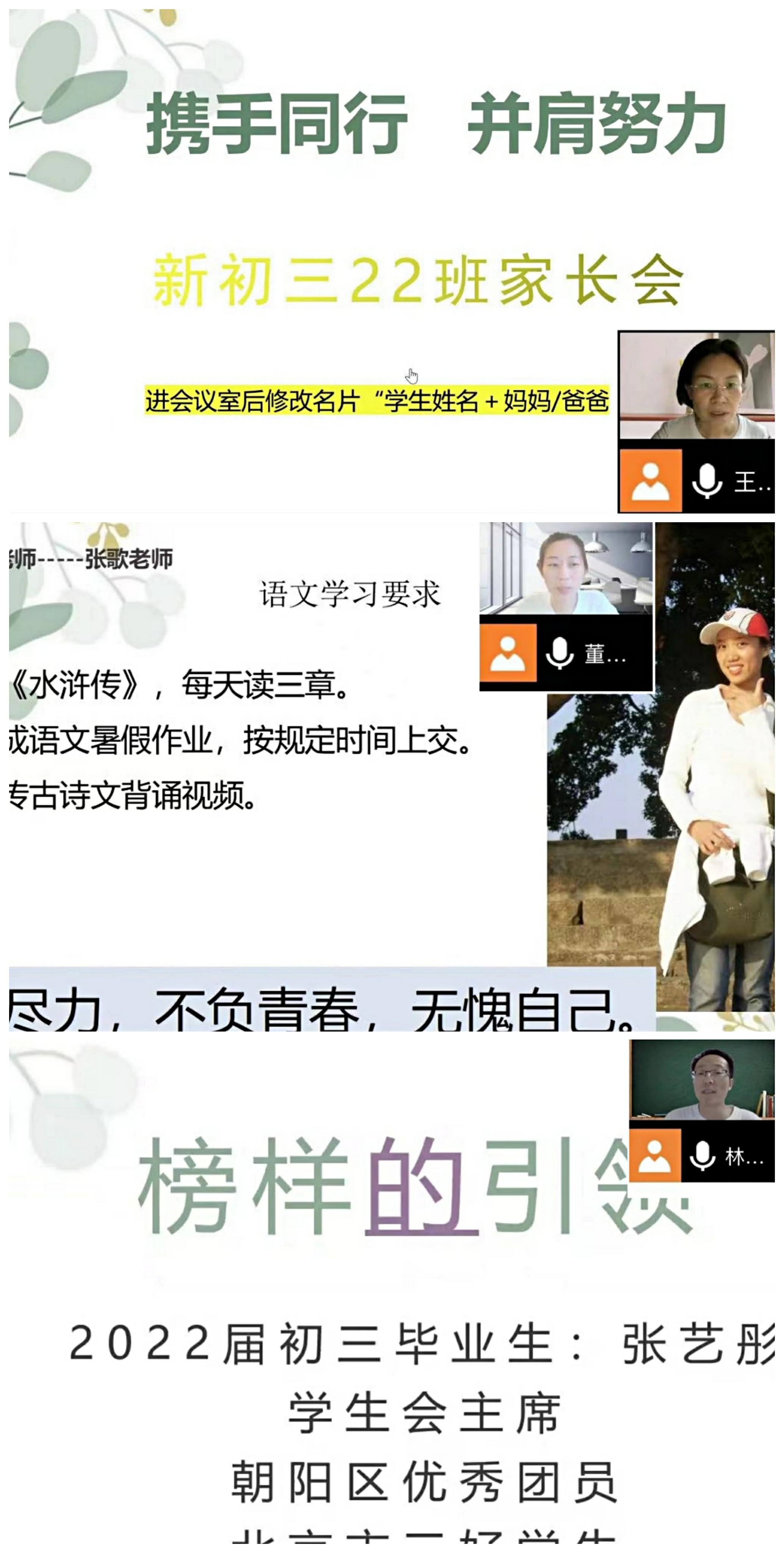 初三年级召开了题为“携手同行,并肩努力”的家长会,本次家长会的目的是希望初三一年家校通力合作,携手并肩,让学生在初中最后一年的时间里不留遗憾。初三年级的所有教师参加了本次家长会。家长会上,班主任向各位家长介绍了班级的科任教师,各位老师认真准备了一张含有自己照片及学科期望的PPT,叮嘱学生在未来的一年时间里更好的学习本学科知识。三位班主任对学校的暑期要求进行了解读,并提出了具体的要求,同时给予学生方法上的指导和合理化建议,向各位家长阐释了假期陪伴的重要性。假期是中考逆袭的最后一个节点,在“双减”背景下,如何高效利用假期,实现弯道超车,至关重要。所以家校携手,踏踏实实抓好孩子的各种习惯,为开学后的学习蓄势!同时也提醒同学们不要放松体能锻炼,并结合体育组的要求给出了具体的体育锻炼方案。