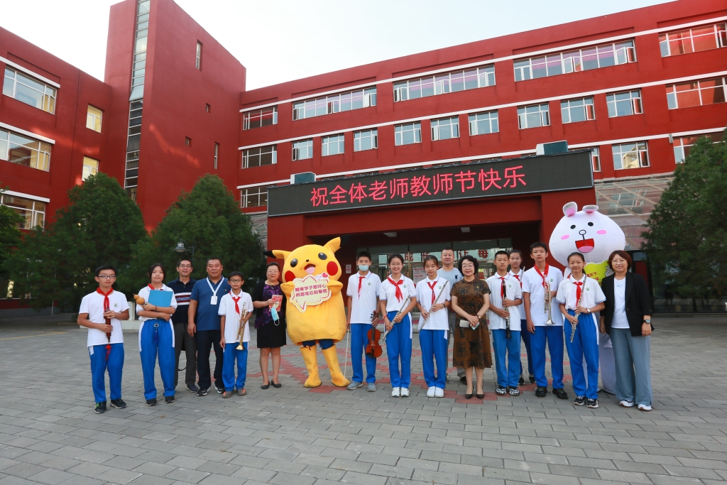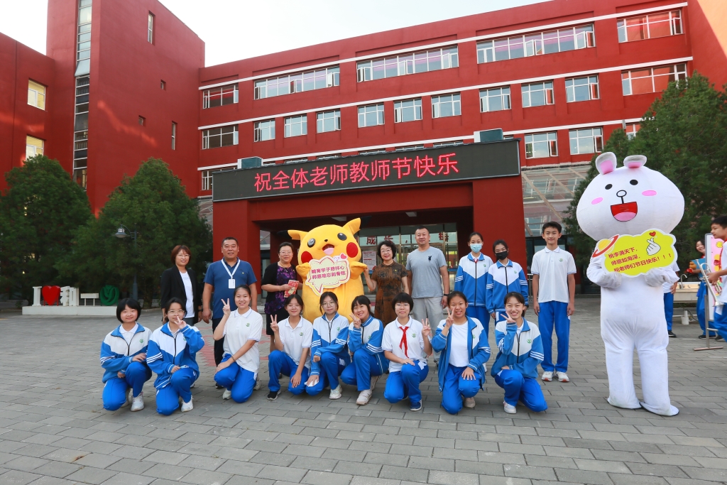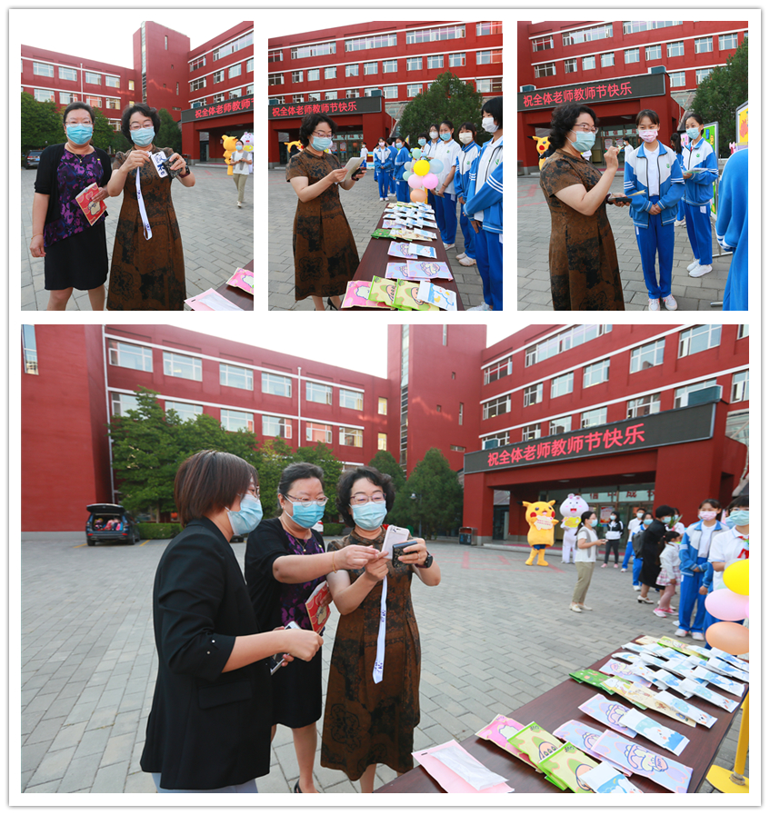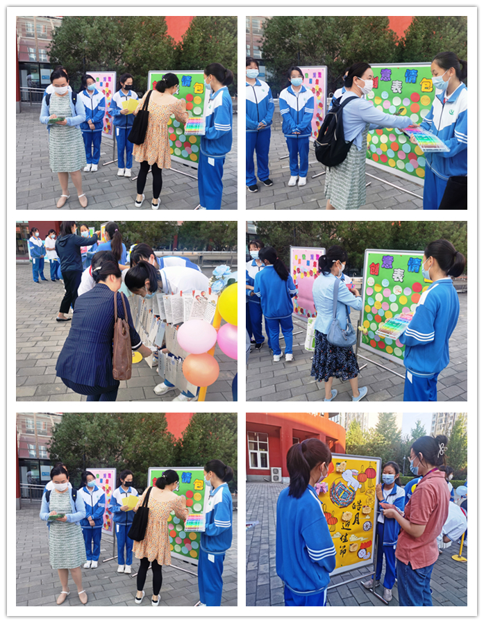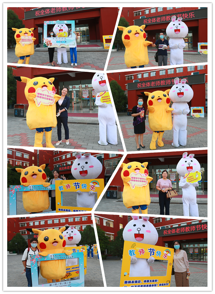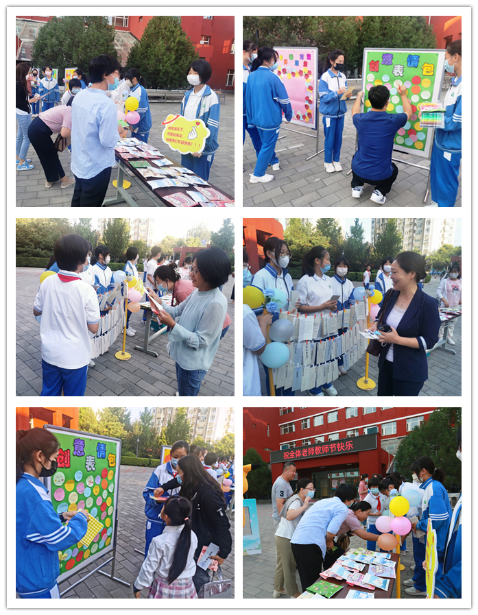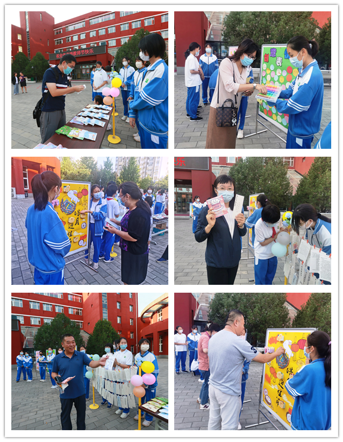 9月9日清晨,伴随着悠扬的乐曲,老师们迈入校园,那是初一年级的学生正在现场演奏。葫芦丝、小提琴、长笛、黑管、小号、大号等乐器粉墨登场,同学们动人的演奏引得老师们纷纷驻足欣赏。学生志愿者为老师送上盲盒小礼包,礼包内 “知食份子”、“饭否”、“瘦否”等不同款式的饭卡夹让老师们惊喜连连。互动游戏区,老师们有的在“创意表情包”处画出自己的个性表情,学生志愿者则为老师贴上“笑脸”标签,祝福老师们笑口常开;有的在“皓月迎佳节”处点亮皓月,收获一枚润喉颗粒糖和祝福千纸鹤;有的在“感念师恩,秋月寄语”书信墙处开心的收到同学们的祝福信件。活泼可爱的玩偶娃娃们则簇拥着喜笑颜开的老师们合影留恋。浓浓师生情,拳拳桃李意,活动现场沉浸在一片欢声笑语中!