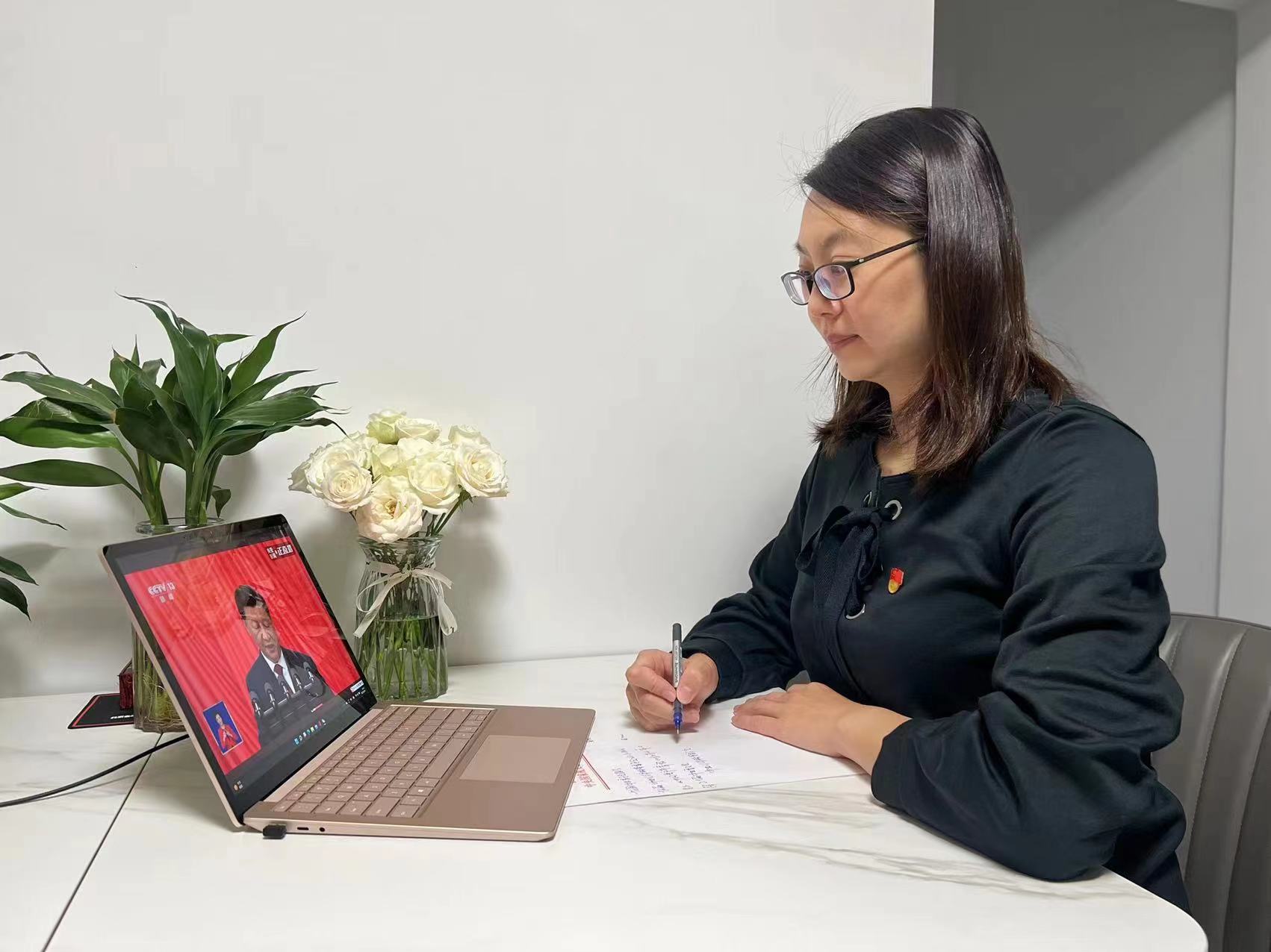 党员教师高岚表示:“今天上午一直在聚精会神听取习近平总书记的报告,被报告中的各项成果、奋斗目标感动着,激励着。百年大党风华正茂,亿万人民自信自强,新时代的中国,党同人民同呼吸、共命运、心连心,中华民族迈向伟大复兴的脚步不可阻挡!”