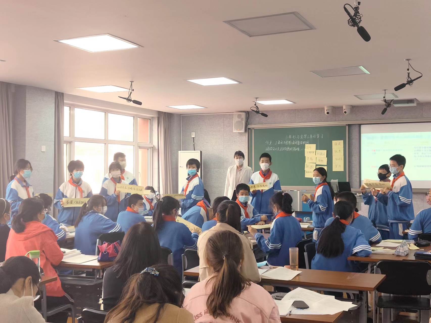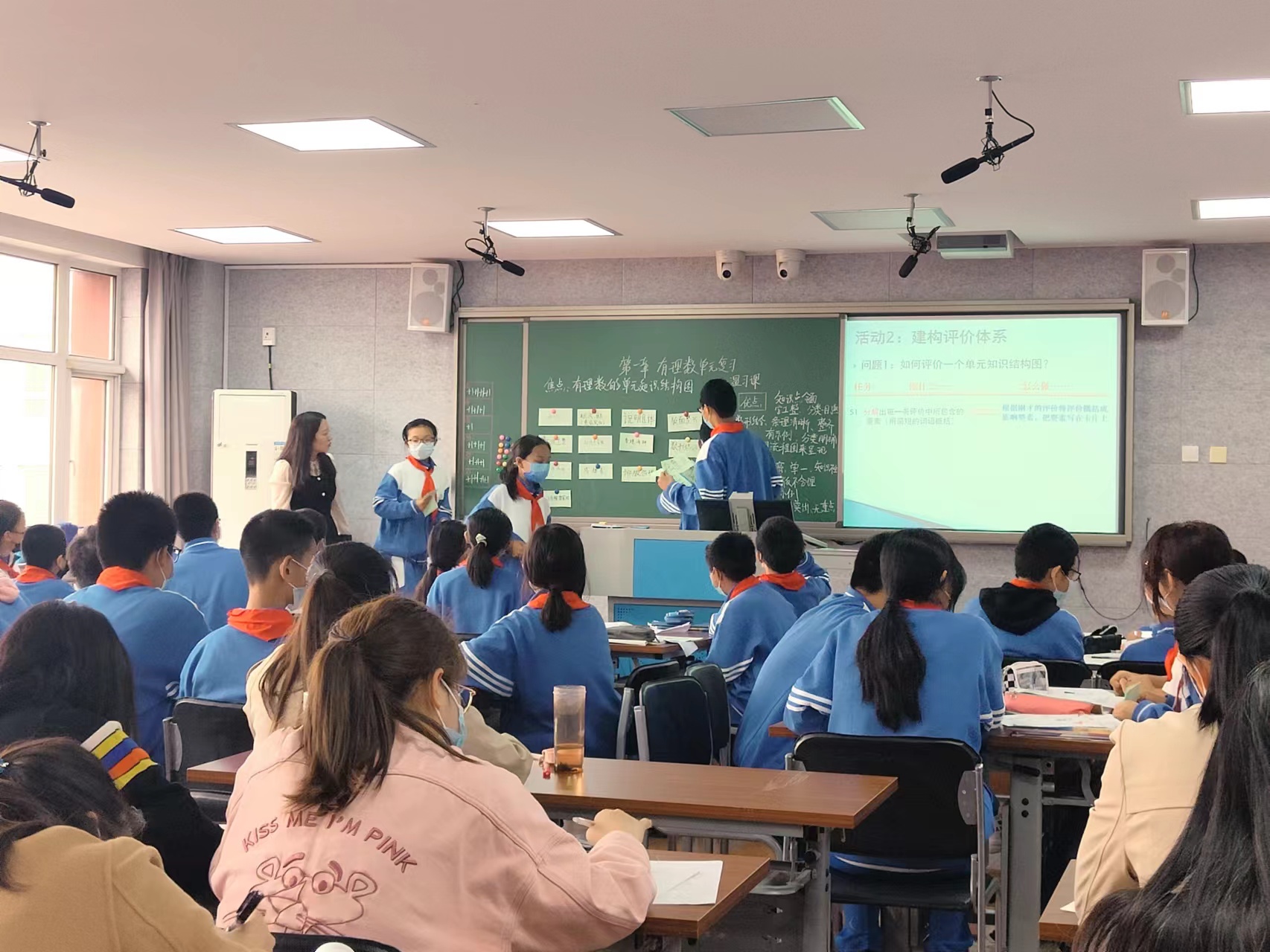 在活动的第一个环节,朝来校区的吝孟蔚老师、郝媛老师分别呈现了《有理数温习课》及《三角形和全等三角形温习课》两节精彩的复习课。两位老师首先让同学们观察并总结测试质量和绘制单元知识结构图之间的关系,从而感受到建构单元知识结构对数学学习的重要意义。吝老师通过让学生分析例图,概括评价标准,并对其进行分类,建构了以“内容、结构和形式”为主要标准的评价体系,学生在评价体系的指引下进行了例图评价和修改活动。郝媛老师通过让学生讨论例图的优点和不足,将评价标准概括成几句话,小组展示,进而建构评价标准,在评价标准的指引下,学生对例图进行了充分的讨论和修改,呈现了更为科学和全面的单元知识结构图。