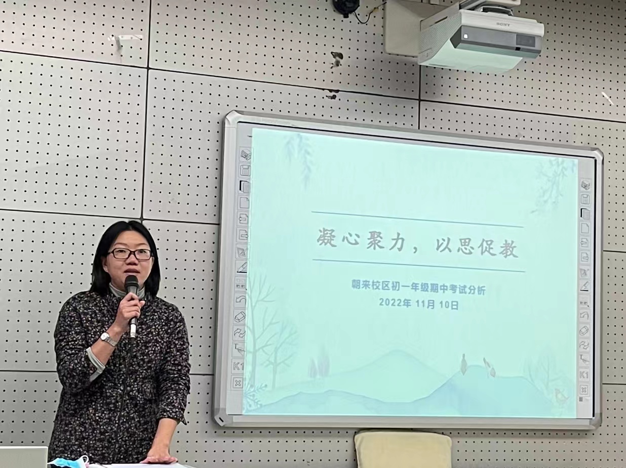 首先,陈莹老师结合期中调研考试的各项成绩数据,全方面多角度地对初一年级各个班级、不同学科的总体成绩进行了细致分析,客观指出本年级教学与学习中的优势及不足。之后对期中前的年级工作进行总结,列举不同班级的特点,肯定年级活动的优秀成果,并提出要继续坚持年级节气、节日活动的开展。最后陈老师对期中以后的工作方向做出指引,特别提出期中以后教师的工作重心由班级建设转向学法指导,设置分层作业,让学生成为集体的带头人。