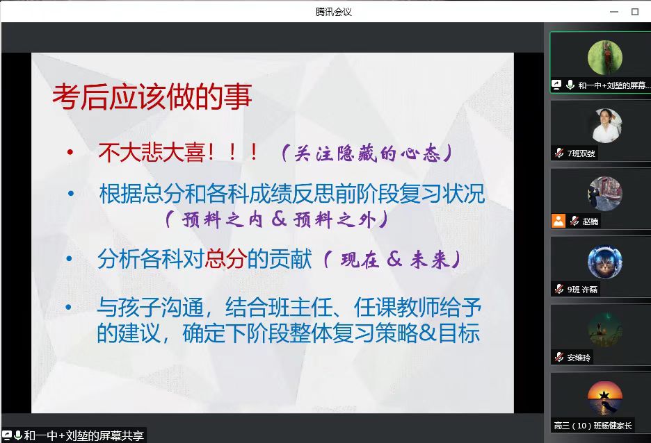 全体年级学生家长会结束以后,高三年级各班分别召开线上班级学生家长会,各位班主任针对本班特点,分层、分批与家长沟通学生在校情况,与家长一起分析学生的学科成绩、学习特点,并制定目标、措施。