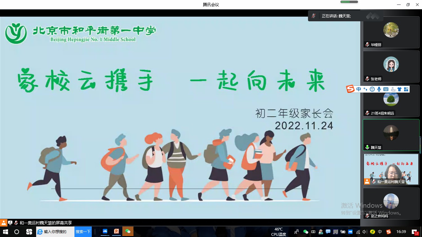 会议第二部分是各班线上家长会,19班张国庆老师以“凝心聚力,助力前行”为主题,从期中总结、树立目标、焦点问题和家校合力四个方面交流;20班毕娅丽老师先回顾了开学以来的班级大事件,接着就教育教学常规和期中分析两大主题与家长交流,最后寄语家长“家校合作,共育英才”;21班韩蕊老师从期中分析入手,就班级情况进行总结与反思,并邀请学生代表分享学习经验,引导学生在期中的基础上查漏补缺,制定下一阶段学习目标与计划;22班崔乐老师就班级期中情况与家长们沟通,特邀四位班级优秀学生代表分享学习方法,并提出网课学习的建议。