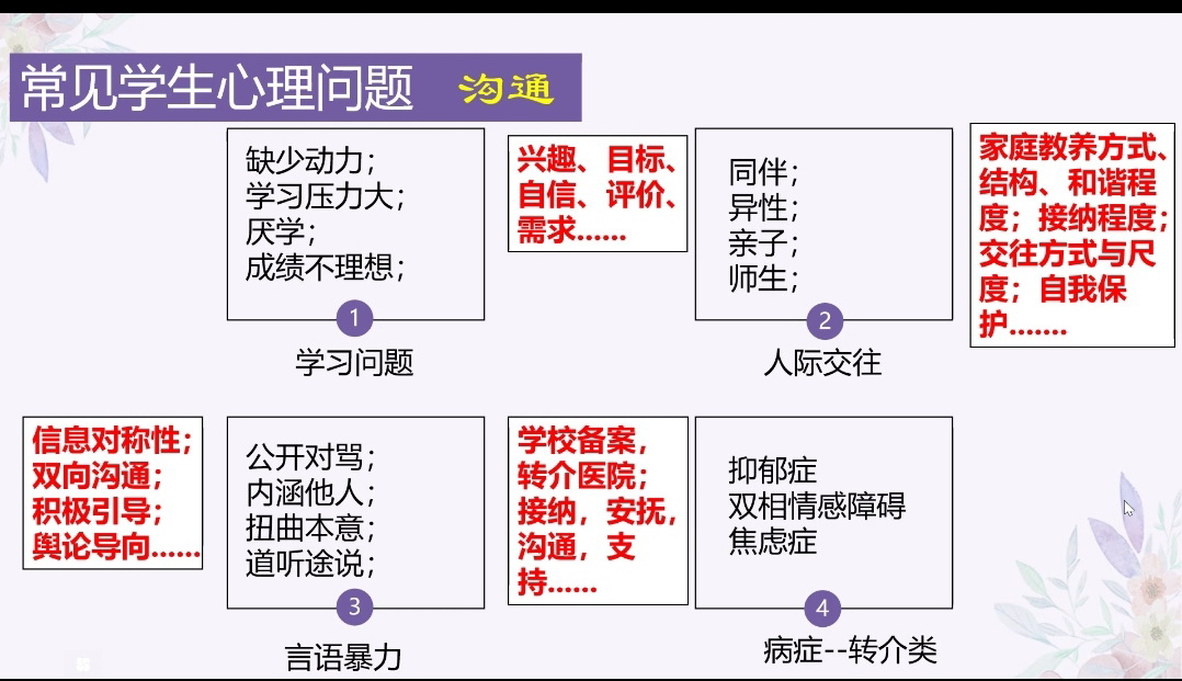 荣旭老师以“做守护孩子的一盏灯”为主题,从“高中生心理发展规律”“学生心理问题预警”以及“学生心理问题分类与应对策略”三个方面,结合心理健康专业知识与学生辅导经验为老师们提供预防及应对学生心理问题的措施方法。荣老师发挥了自己的专业优势,为学生的心理健康点亮了一盏灯。“点亮属于自己的那一盏生命之灯,既照亮别人也照亮自己”。我们每个教师都应该成为一位点灯人,为孩子们驱散迷途的雾,照亮前方的路。