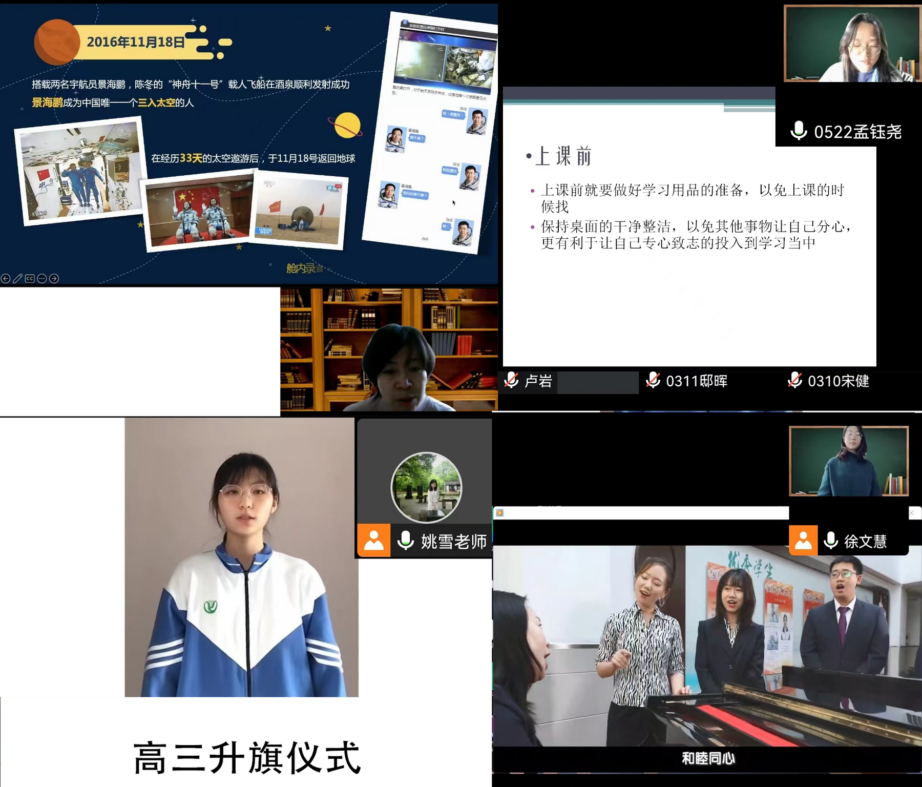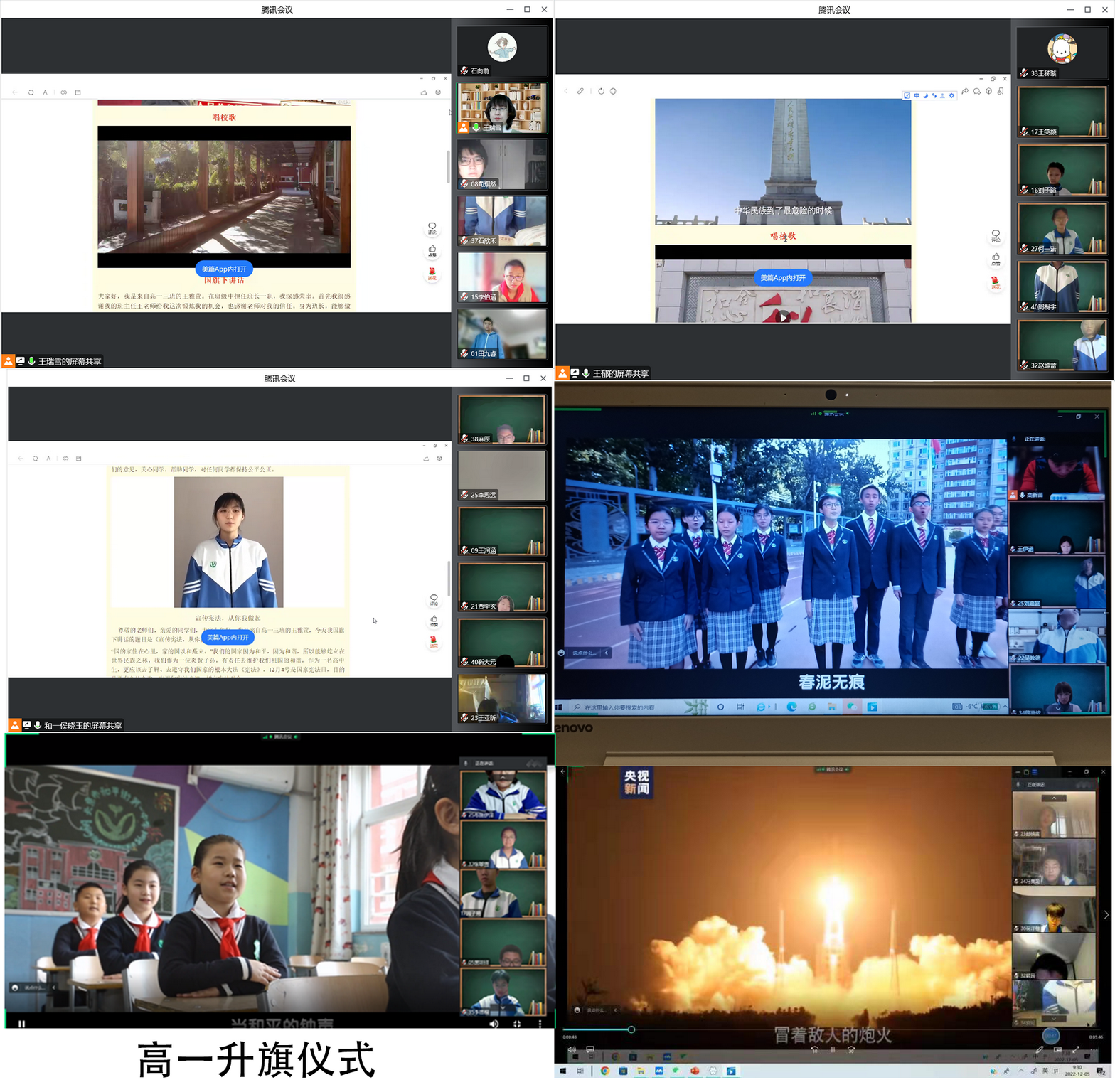 在线上教学期间,为落实教育教学常规管理,学校恢复了线上升旗仪式。11月28日,和平街一中和平街高中校区开展了第一次线上升旗仪式,此次升旗仪式由各班自主设计举行。为了使升旗仪式更加的规范和有教育意义,学生发展处在和各位年级组长、班主任沟通交流之后,对升旗仪式的规范与流程进行了统一,并制作了升旗仪式的流程模板,将国歌、校歌及国旗下讲话等视频内容加入模板,方便各班升旗仪式期间观看使用。