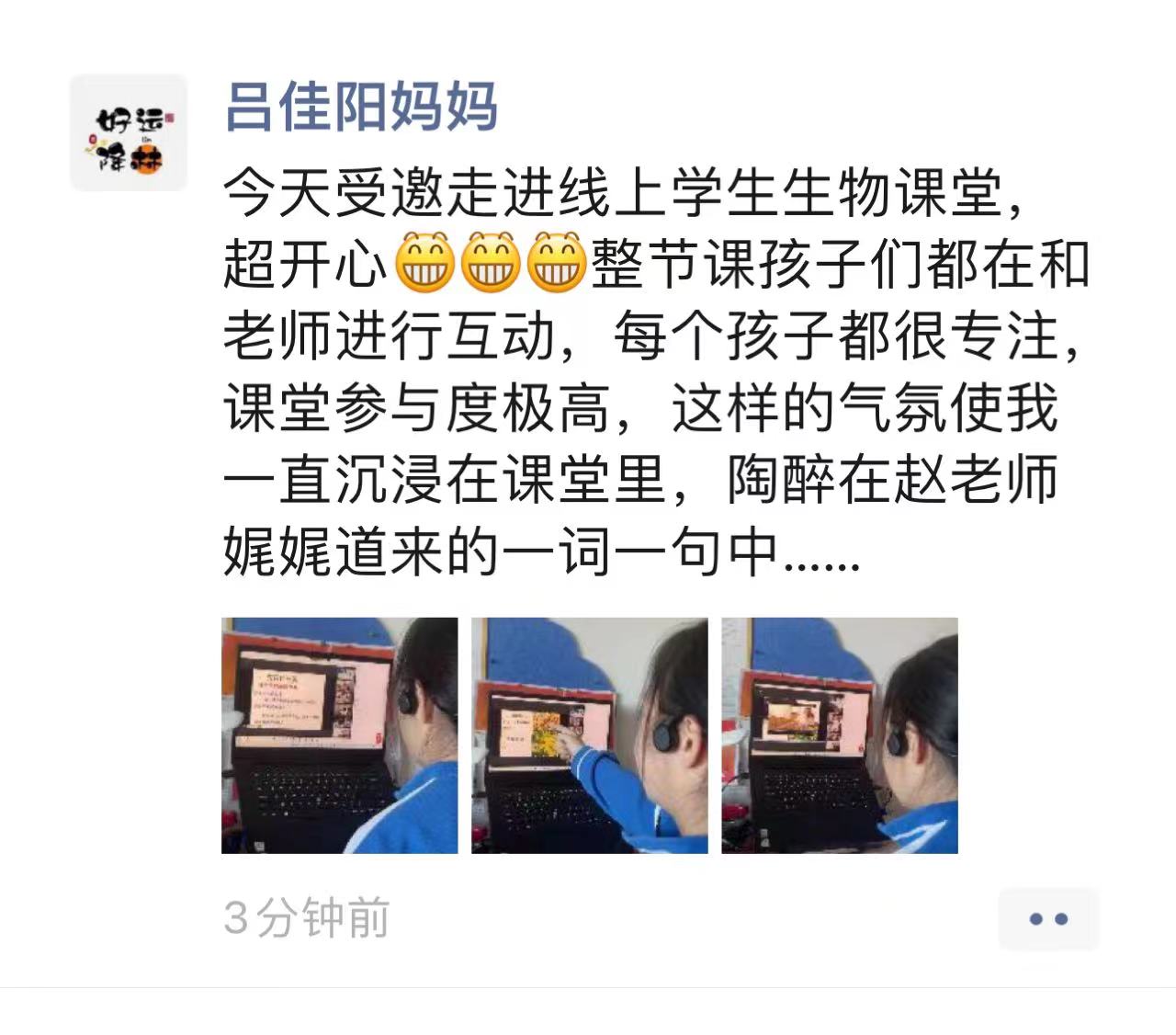 各班的家长朋友们在百忙之中,抽出时间,参与了此次线上公开课活动,与孩子们一起感受到丰富的线上教学活动。听课的家长朋友们积极反馈自己的听课感受,对学校组织的这次活动表示感谢,对老师们的真情付出、专业授课给与了很高评价,同时也提出了一些中肯的建议,字字真诚真心,带给了老师们启发。家长朋友们的鼓励、肯定与感谢也激励着老师们更加鼓足干劲,持续努力,不断进步。