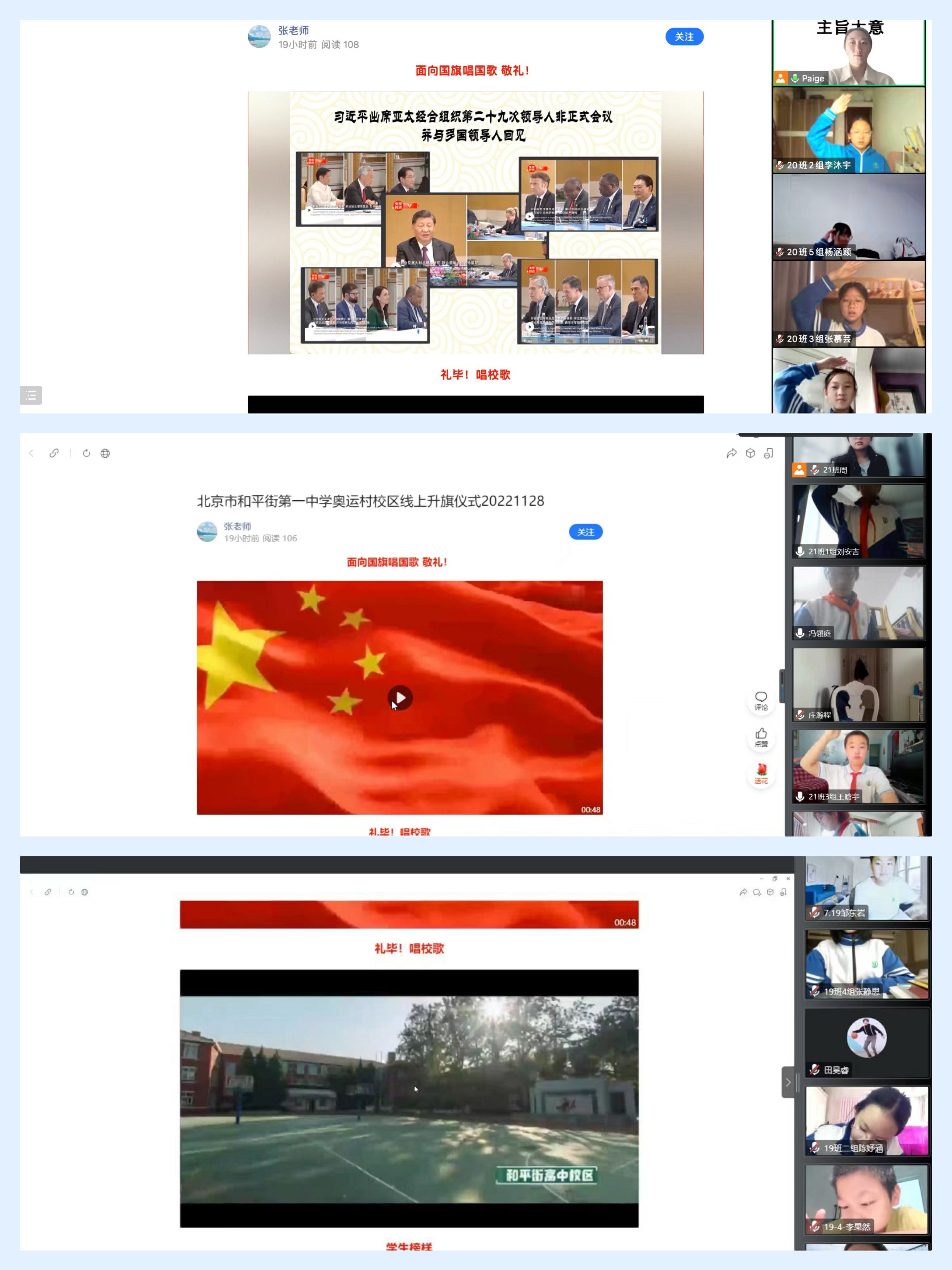 师生云端相聚,唱国歌、校歌,听学生国旗下讲话和家长代表寄语、看优秀学生表彰。学生从鲜艳的国旗中感受中国力量,在激昂的国歌中唱响民族强音,从声声寄语中汲取力量,在先进表彰中坚定梦想。