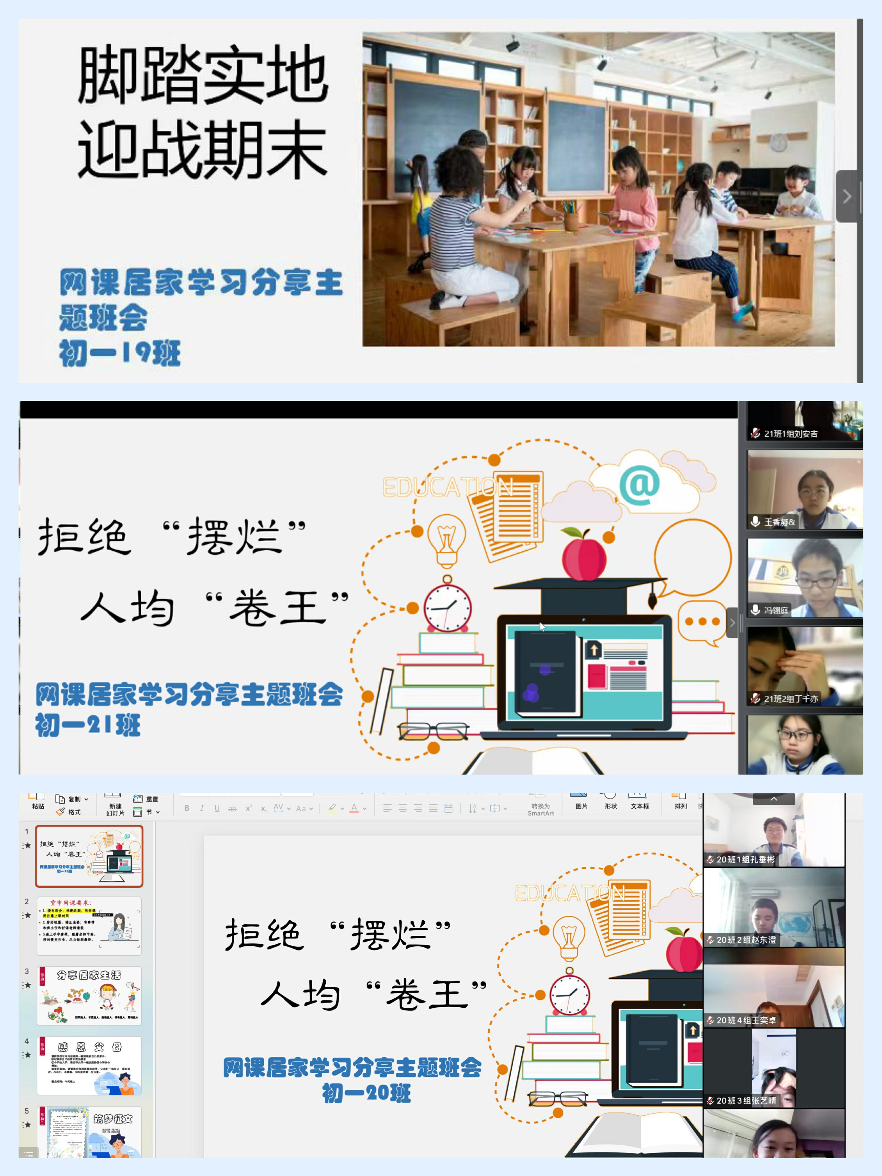 初二年级各班班会以《“卷”与“躺”》、《网课那些事》、《团队的力量》、《别拿网课不当回事》为主题,帮助学生更好的适应居家学习生活,弯道超车,做最好的自己。