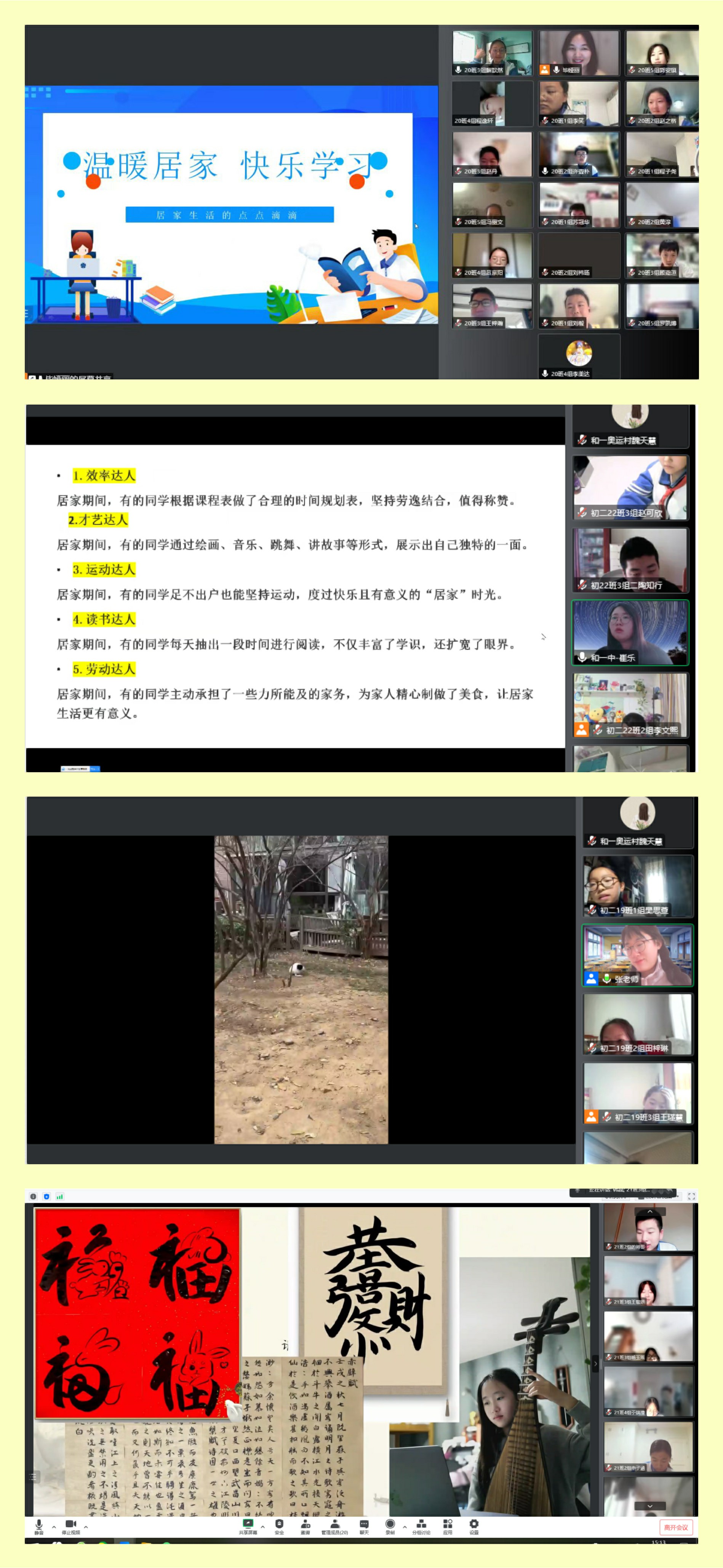 各班推选出班级“效率达人”、“才艺达人”、“运动达人”、“读书达人”、“劳动达人”学生做分享,通过分享缓解学生心理压力,同时树立学生榜样,引导学生科学合理的度过一个身心健康、充实、有意义的居家学习生活。