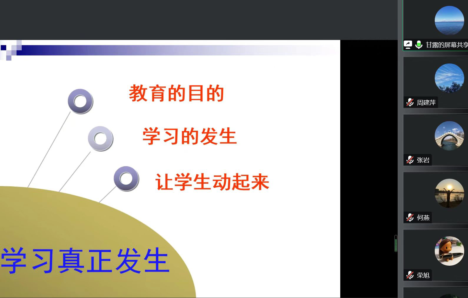 甘露老师分享的题目是《让学习真正发生》。甘老师从“教育的目的”“学习的发生”“怎么样让学生动起来”三个方面讲述了如何调动学生的自主学习能力。分享过程中,甘老师借用英语演讲视频《every kid deserves a champion》,强调教育本身是人和人的一种联系,当教师的教和学生的学能够产生共鸣,或者是发自内心的认同,那么这个时候的课堂才能对学生产生正向的影响,才能触动学生的内心,让学生的学习真正发生。甘老师借用大家比较熟悉的灰姑娘的故事和澳洲骆驼的故事举例,讲述怎么去调动学生的思考能力。分享的最后,甘老师再次强调,作为教师,身上肩负着时代赋予的责任与使命,教师要做到热爱学生,热爱自己所教的课程,并创造性的去使用教学资源,才能真正的让学生动起来,参与到课堂之中。