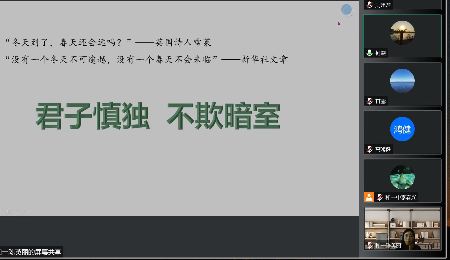 陈英丽老师分享的题目是《教与学中的“以情移情、共情”》。陈老师从心理学的角度讲述了移情与共情的定义。她强调,教师首先要充实自我,努力做学生源源不断的活水。扎实的知识功底,过硬的教学能力,勤勉的教学态度,科学的教学方法,是一个教师最基本的素养。因此教师要始终学习,要站在知识的前沿,刻苦钻研,严谨笃学,不断充实拓展,提高自己。第二就是即使是线上教学,也要突出学生的主体作用。每堂线上课程都要精心设计,要随时观察学生上课时的状态,对学生进行赏识教育。陈老师强调在课堂上调动学生课内外的学习积极性非常重要,做学生的良师益友,学生是活生生的人,他们有感情、有自己的个性,所以教师要尊重每个学生的个性,用放大镜去挖掘学生闪光点,采用赏识和激励的教育,就像欣赏花一样,做到有爱无类,给予学生温暖,让他们做最好的自己。陈老师最后以“君子慎独,不欺暗室”八个字作为最后的总结,强调教师要注重自己的行为,严于自律,做学生真正喜爱的教师。