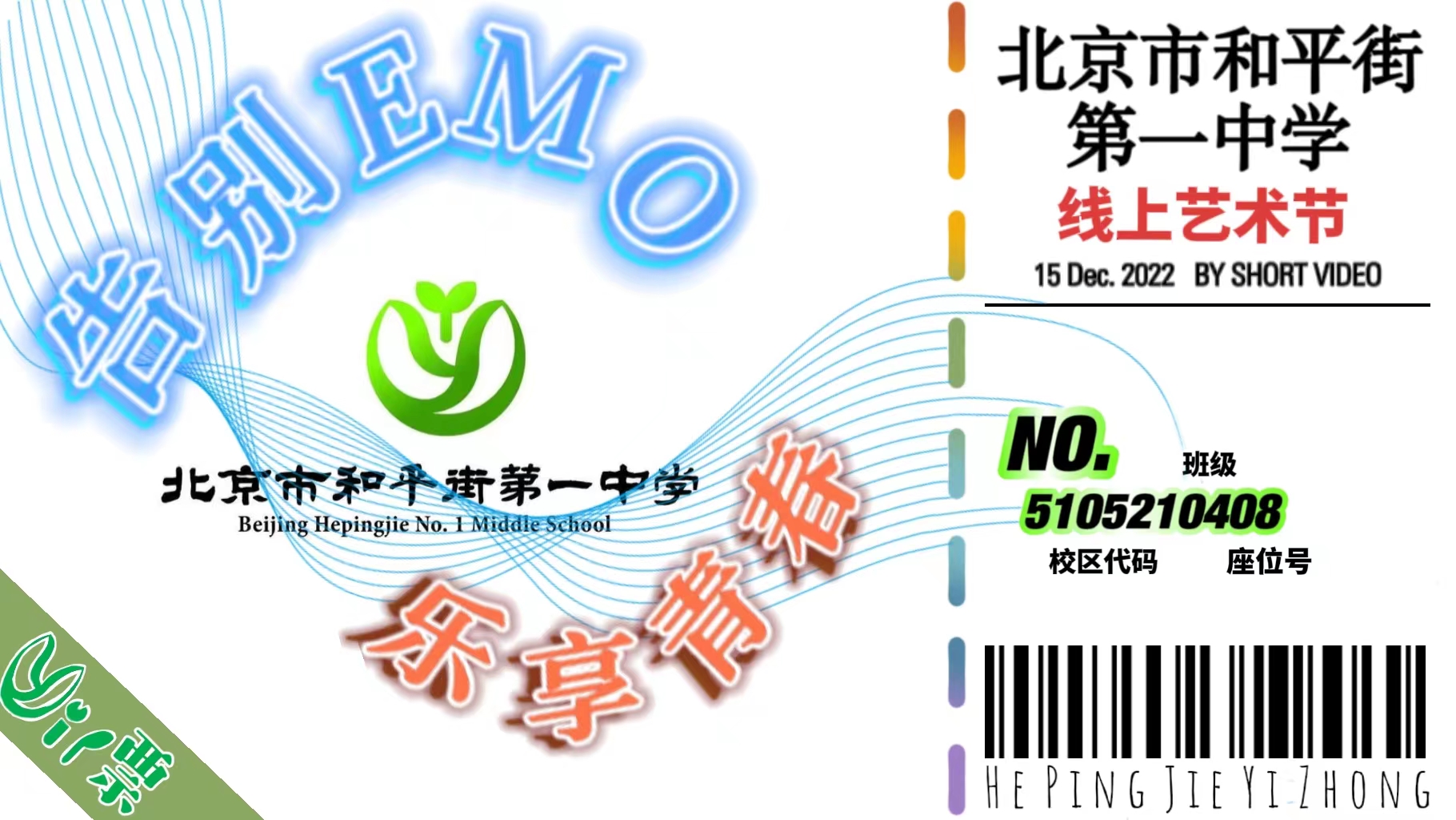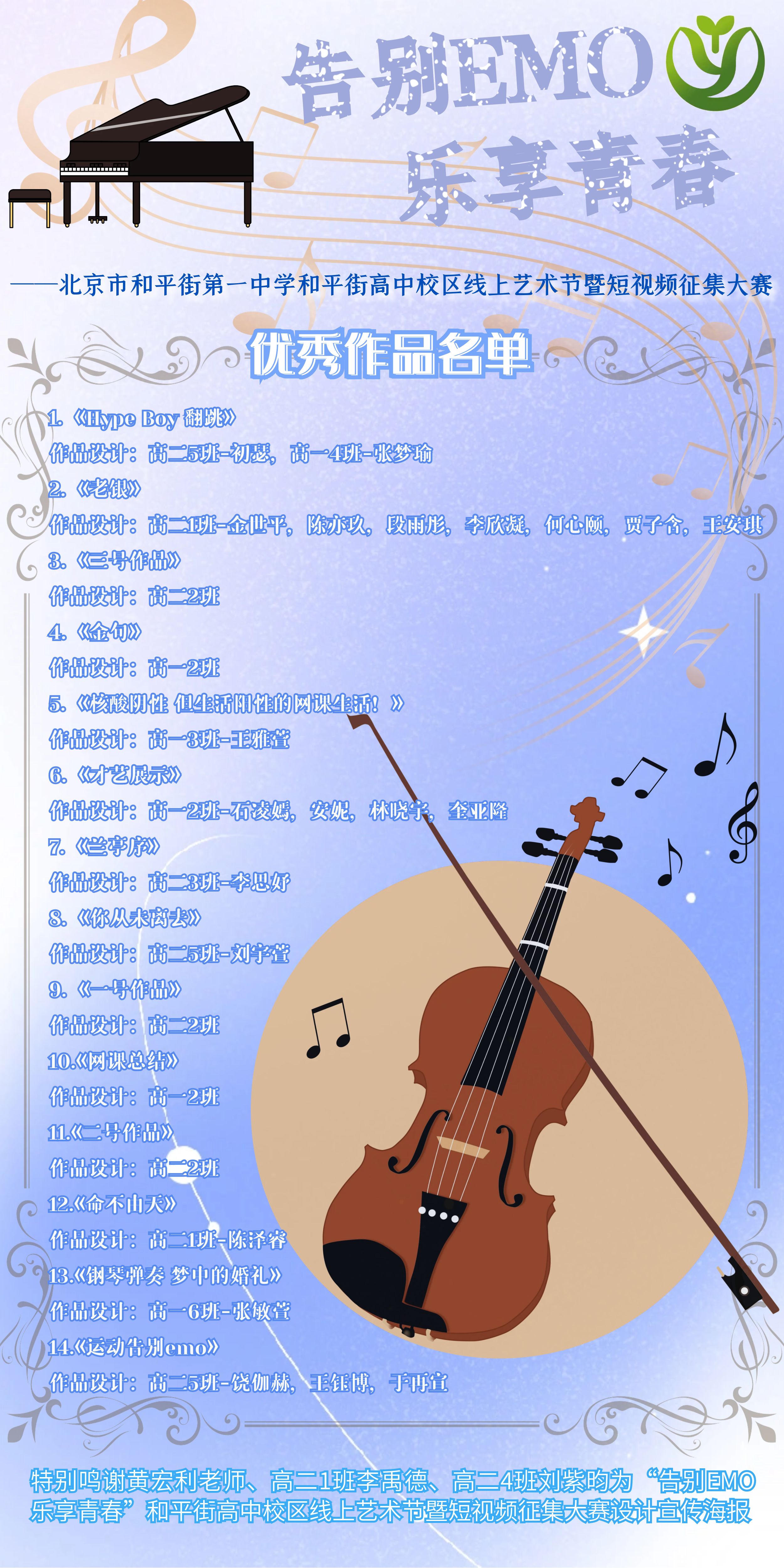特别鸣谢黄宏利老师、高二1班李禹德、高二4班刘紫昀为“告别EMO 乐享青春”和平街高中校区线上艺术节暨短视频征集大赛设计宣传海报。