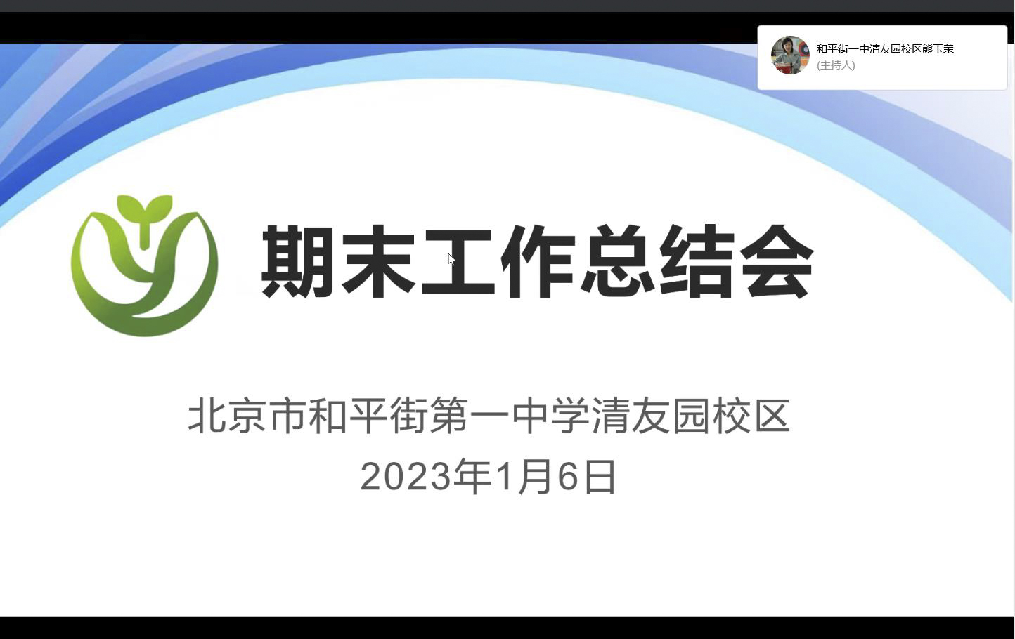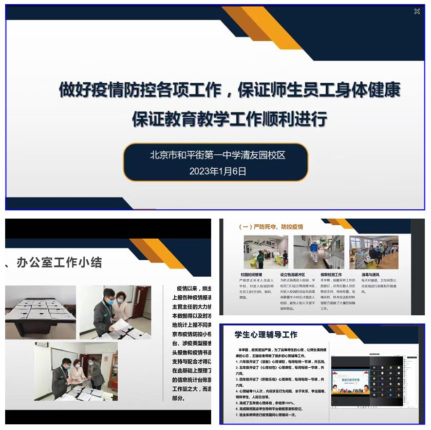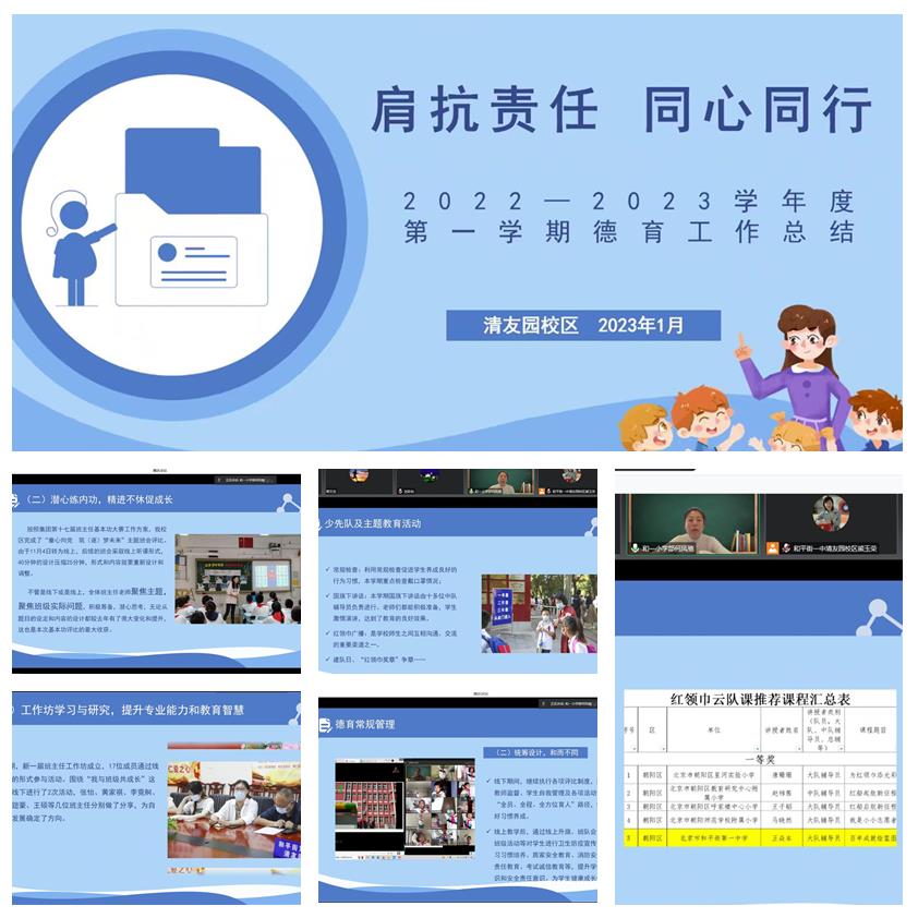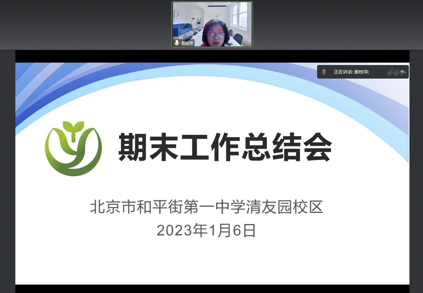 期末的脚步悄然走来,充满收获的一个学期即将结束! 2023年1月6日上午,和平街一中清友园校区以线上会议形式召开了2022—2023学年度第一学期期末总结大会,校区主管校长殷桂萍主持会议,全体教职工参会。
