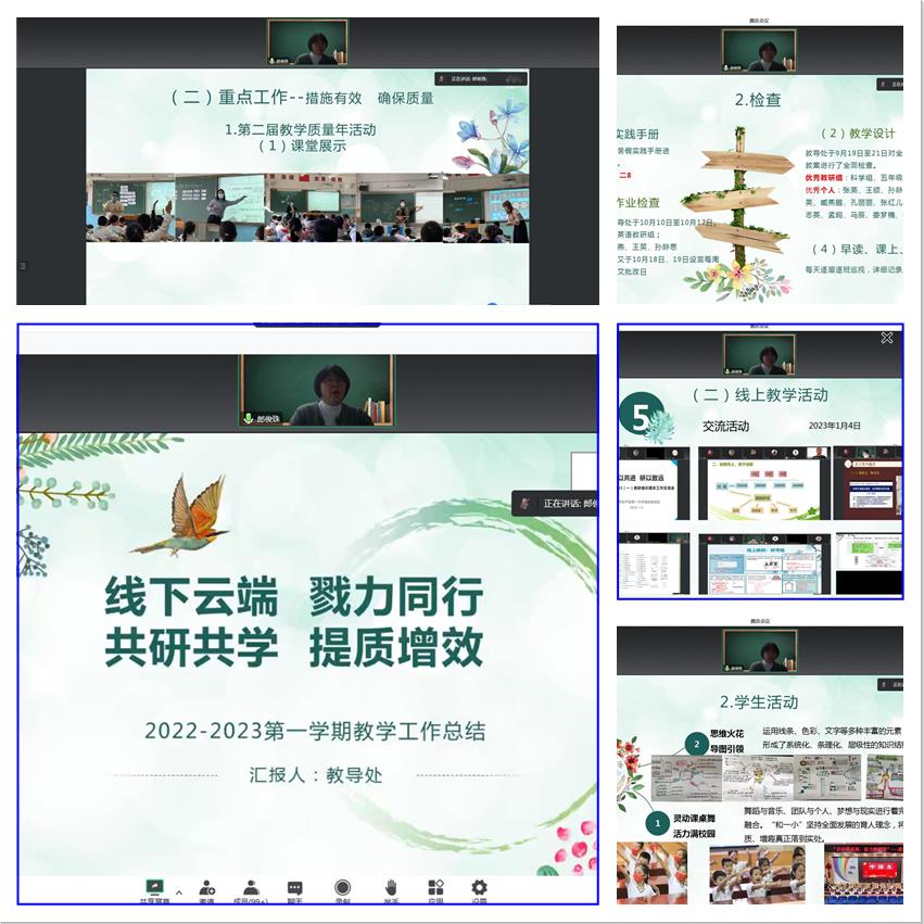教学主任郎俊珠以“线下云端戮力同行 共研共学提质增效”为题进行总结。教导处从线上教学的前期开展,到课程安排、教师团队共研,每一步都精心设计、精细部署、精准施策,不但实现了线上线下教学无缝衔接,更有效调动了教师们的主动引领作用,在严谨实施下,真正做到了线下云端戮力同行,顺利完成了本学期的教学工作。