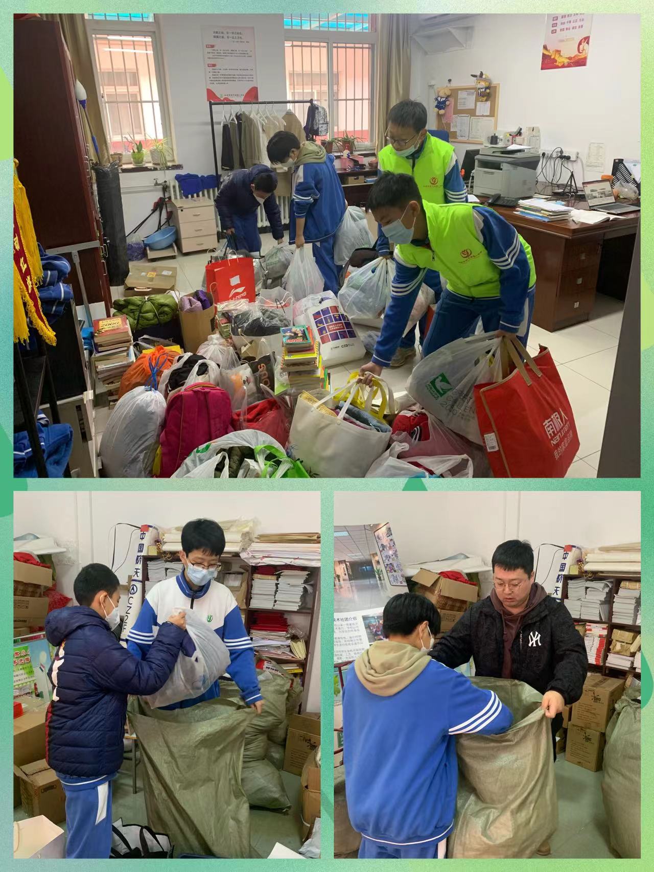 学生会志愿者们将要捐赠的物品打包得整整齐齐,收拾得干干净净,部分教师也参与到整理捐赠物品的队伍之中。在志愿者与老师们的齐心协力下,对所有捐赠物品仔细地进行了清点登记,再重新分类汇总打包。截止活动结束,全校师生共捐赠物品八百余件。