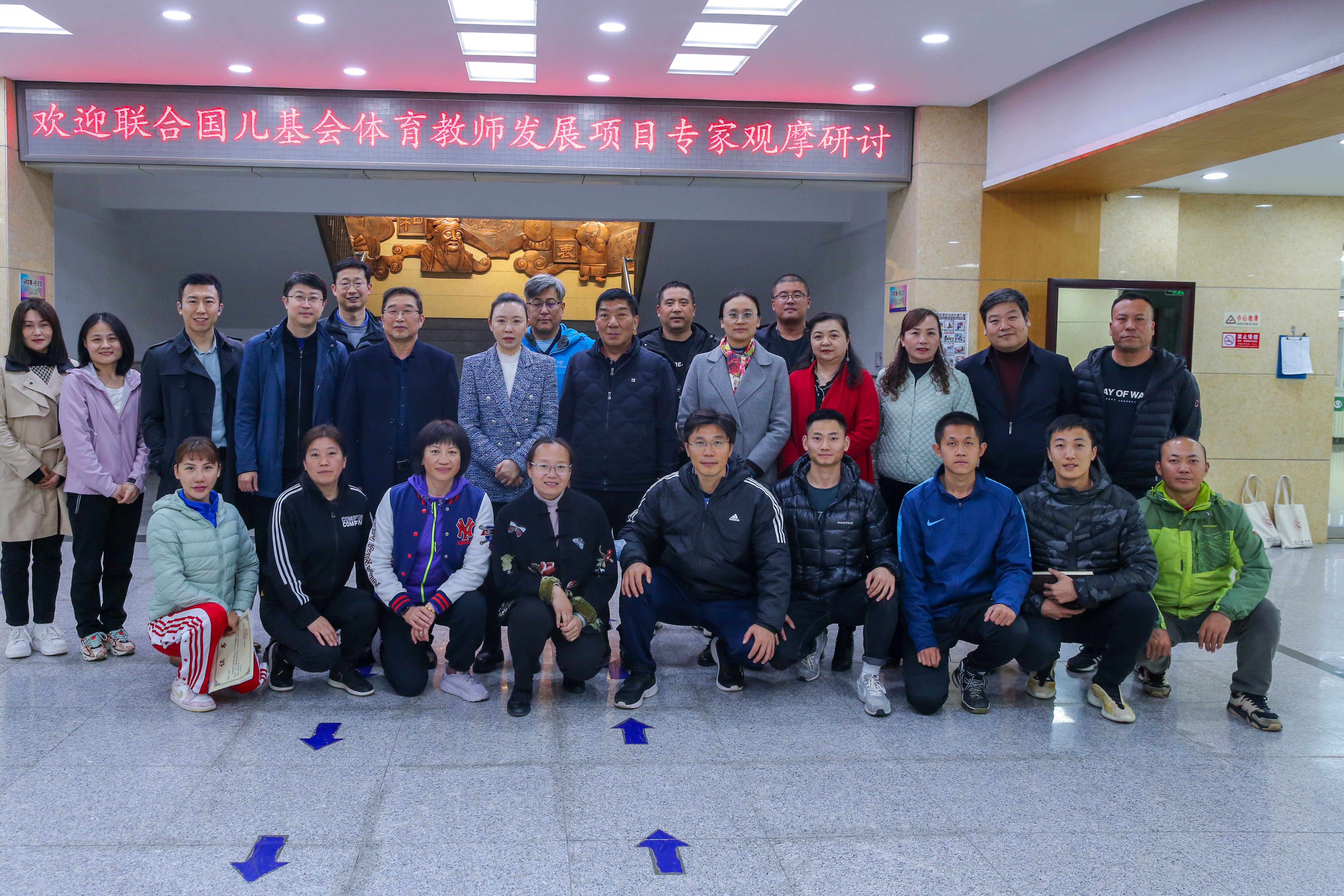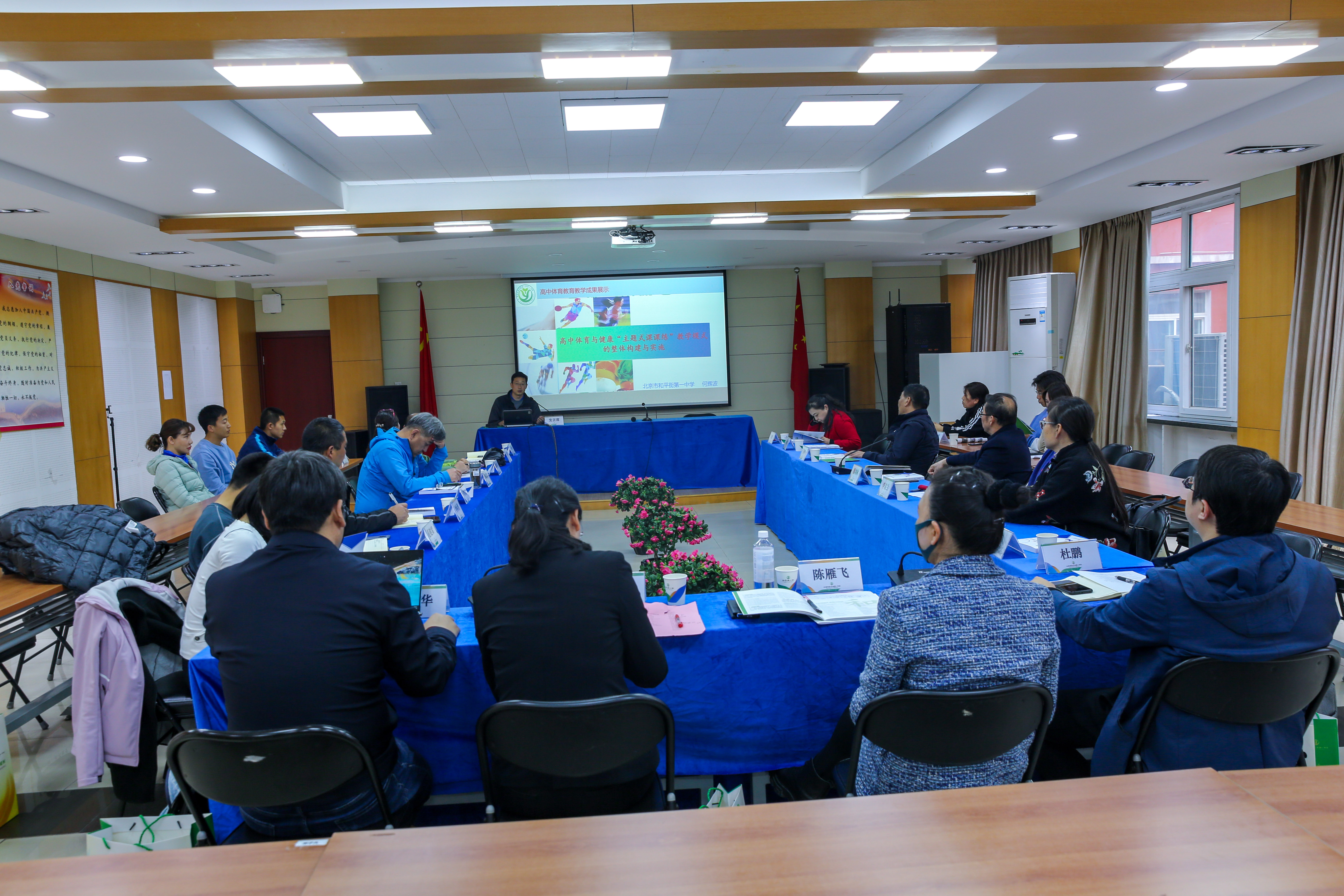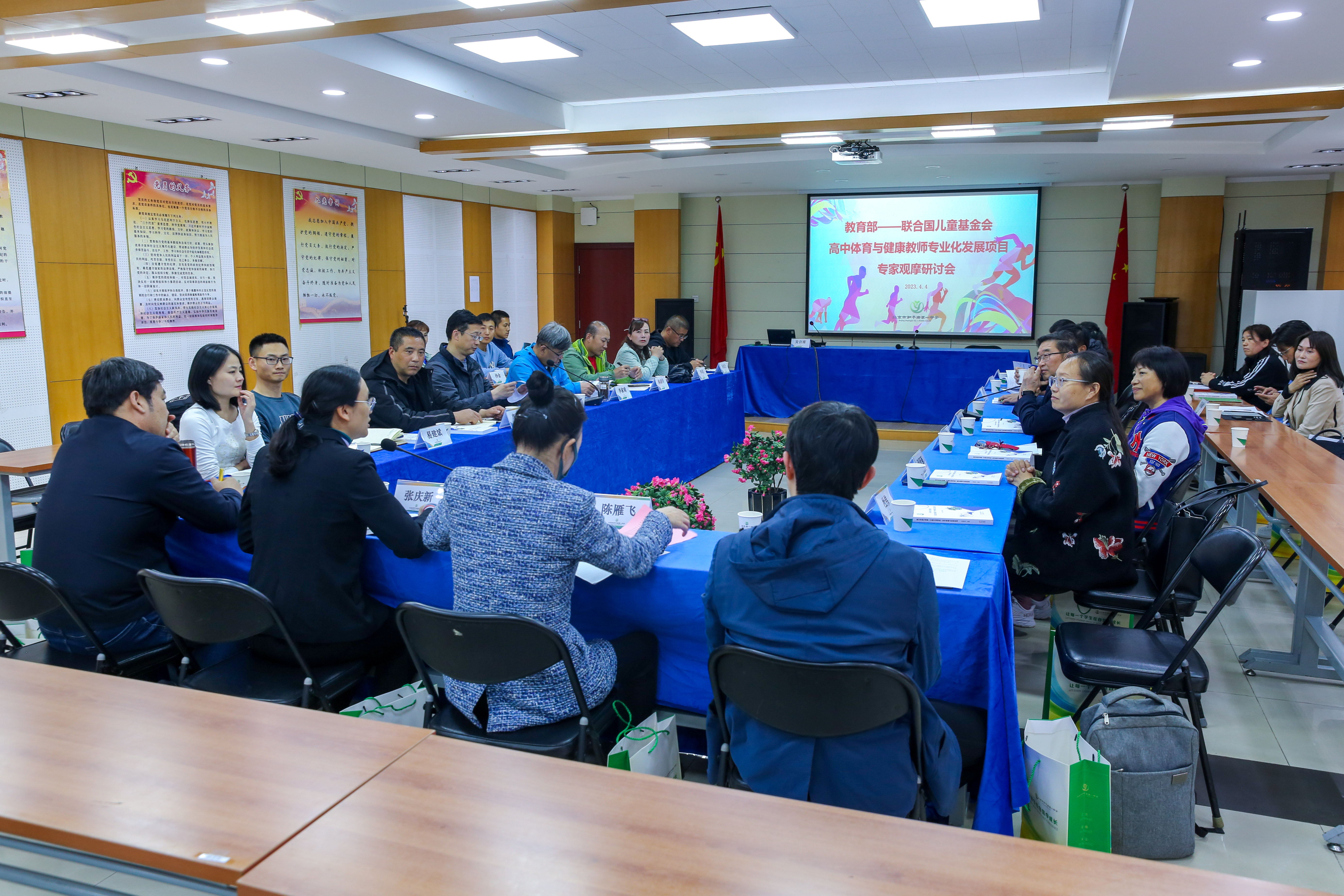 2023年4月4日下午,北京市和平街第一中学莲葩园校区召开“教育部—联合国儿童基金会高中体育与健康教师专业化发展项目2023年度国家级培训观摩研讨会”。参与这次观摩研讨会的人员有:北京教育学院陈雁飞教授、张庆新副院长和易建斌老师,联合国儿童基金会杜伟老师,《中国学校体育》主编种青老师,郑州市、开封市、贵阳市、铜仁市、昆明市、红河州的教科研领导和教研员,朝阳区教师发展学院孙卫华副院长,朝阳区中小学体育名师(何辉波、刘萌、冯丽敏、李京兰、张跃强、王丽宏、李军)和莲葩园校区的体育教师。本次研讨会在陈雁飞教授的引领下,进行了朝阳区中小学体育发展情况分享和体育教学及未来发展情况研讨。