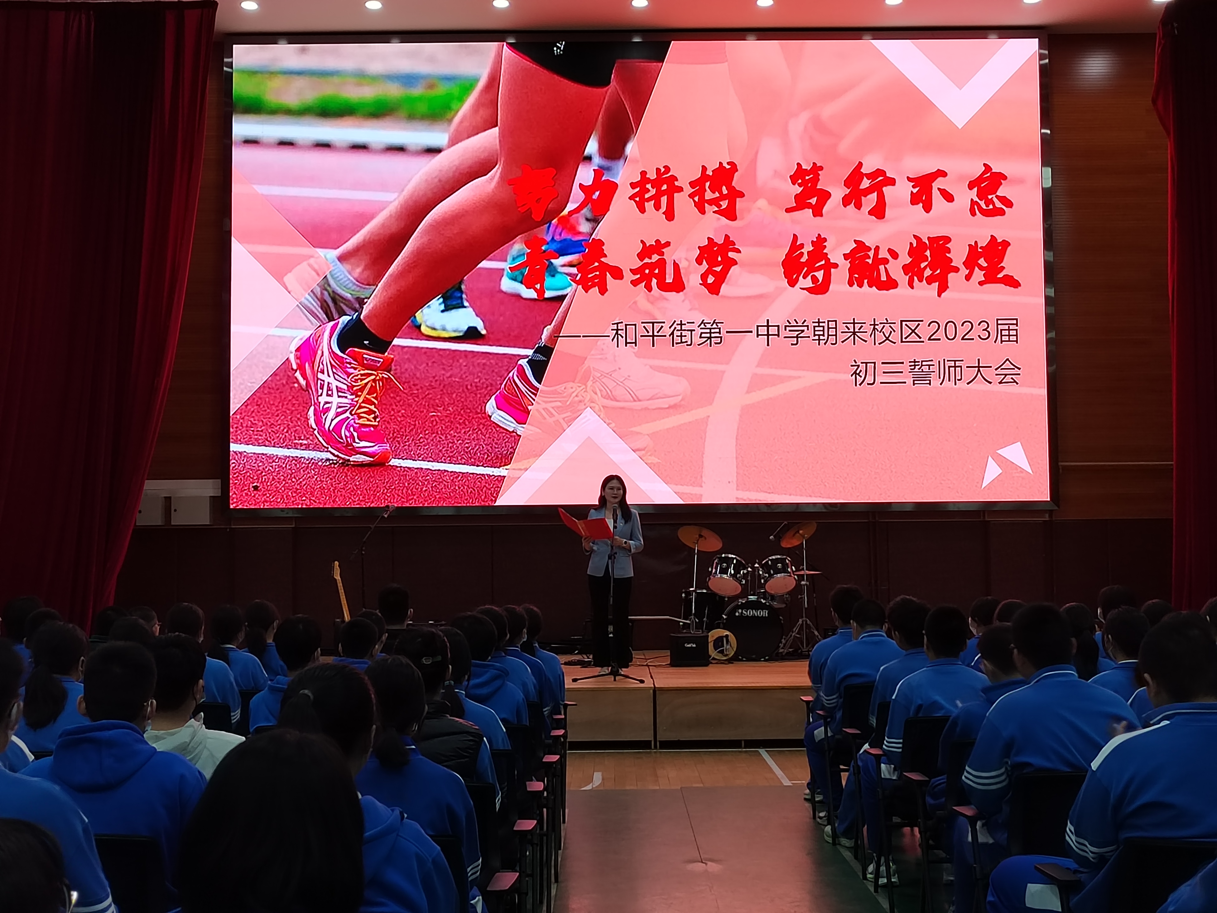 千红万紫已绽放,更待新雷第一声。随着毕业的脚步临近,怀着对美好未来的憧憬,2023年4月4日,北京市和平街第一中学朝来校区2023届初三年级举行誓师大会。全体初三师生参会,会议由高敏老师主持,朝来校区主管张景鲜副校长、邓立副校长、教务处邵秋乾主任、学生发展处张东辉主任、韩晓佳主任都来为同学们鼓劲助威。