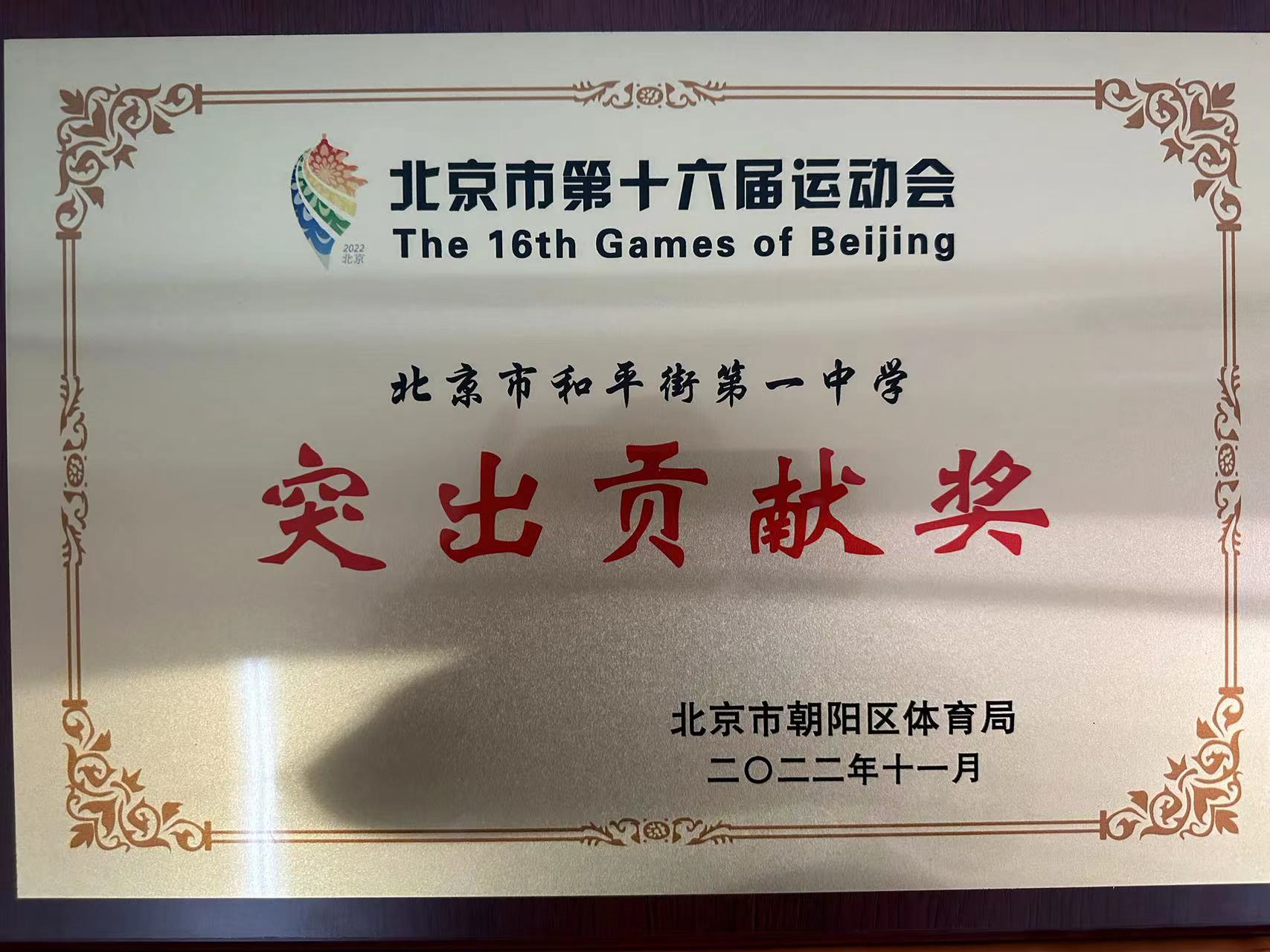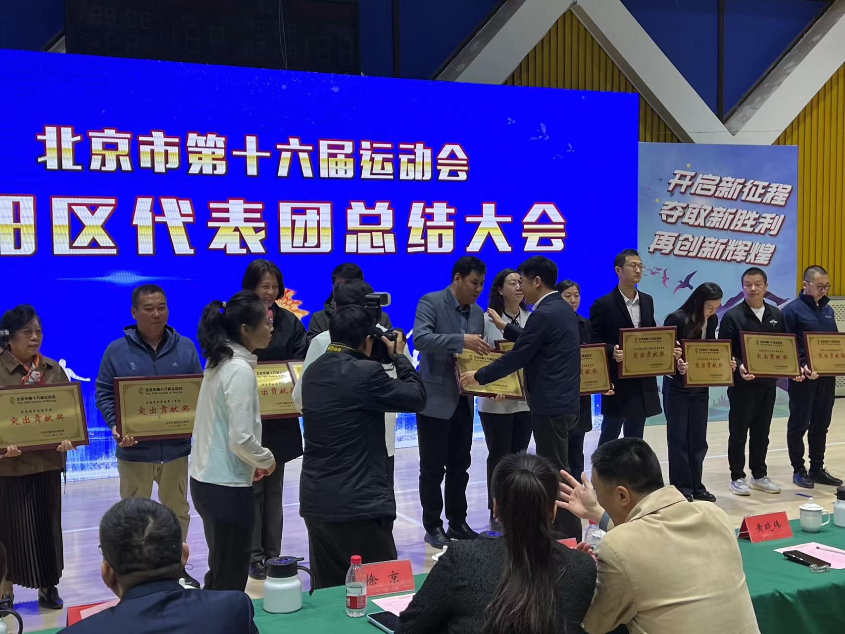 2023年4月13日上午,北京市朝阳区体育局在朝阳区体育馆举行了第十六届北京市运动会朝阳区代表团总结表彰大会。朝阳区人大常委会党组书记、主任陈宏志,朝阳区区委常委、宣传部部长黄晓伟,朝阳区副区长杨蓓蓓,朝阳区体育局党委书记周长春、局长吴晓军,朝阳区教育委员会副主任耿建等领导以及朝阳区代表团的优秀运动员、教练员代表和部分受邀学校代表出席了表彰总结大会。在大会上,区体育局吴晓军局长和区政府杨蓓蓓副区长分别就市运会朝阳区代表团的表现进行了总结,同时也评选出了多个奖项,北京市和平街第一中学获得“突出贡献奖”。