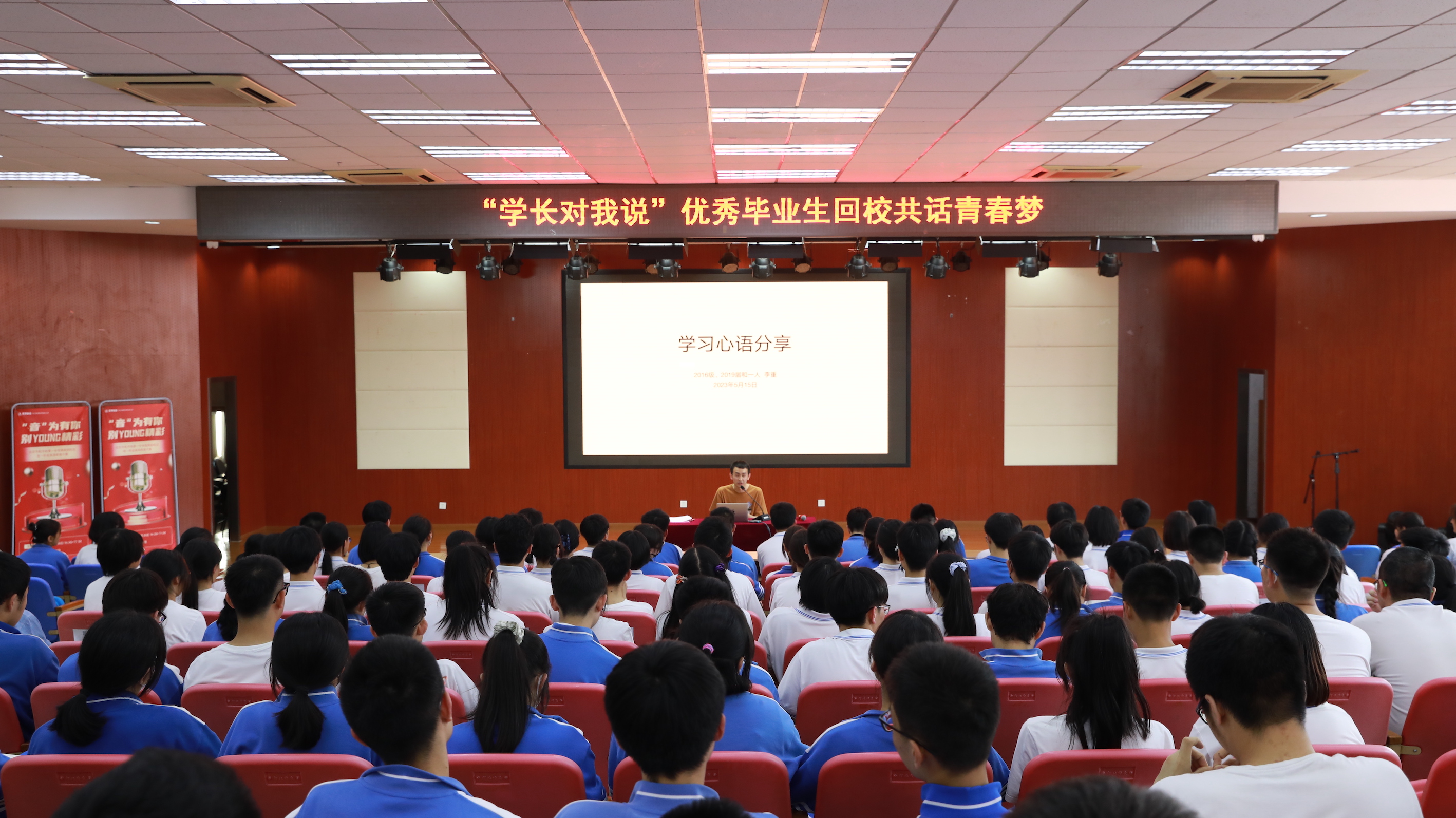 首先,进行了“学长对我说,优秀毕业生回校共话青春梦”环节。学校邀请2019届优秀毕业生李重返校和同学们进行了学习心语分享。李重学长现就读于首都师范大学生命与科学学院,他生动讲述了自己的学习和成长经历,分享了许多大学生活的精彩片段,激发同学们对美好大学生活的憧憬与向往,从而内化为努力学习的驱动力。李重学长还结合自身的高中学习,为大家介绍了时间规划、高效听讲、解决错题、劳逸结合等提高学习效率的方法。同学们在学长的介绍中,大有收获,相信每一位同学都能找到适合自己的办法,将对未来殷切的期待转为当下努力学习的动力,稳步向前。