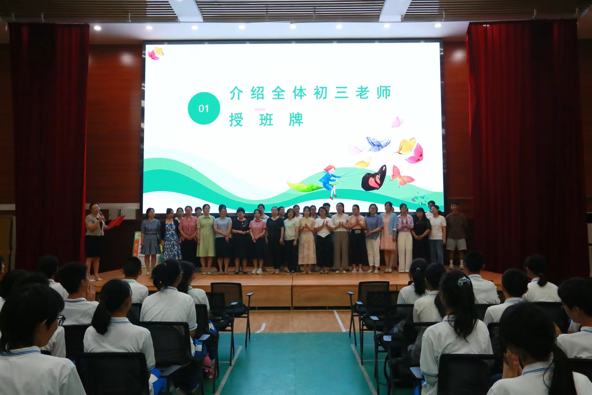 首先由张景鲜副校长介绍新一届初三教师队伍。这是一支充满活力、富有经验的队伍,他们集细心、耐心、爱心于一身,教之有法,施教于乐。相信在这样一支队伍的保驾护航下,新一届初三学子一定会厚积薄发,一飞冲天。随后,各班班主任接过张副校长授予的沉甸甸的初三班牌,将它们郑重的悬挂于班级内,自此,标志着全体同学跨入初三。