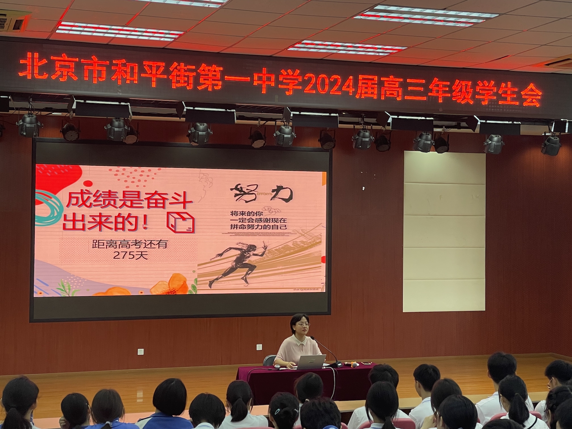 号角一声风雷动,三军发轫启征程。为更好地统筹安排高三新学期各项工作,精心谋划开局新篇,激发学生斗志,迎战高三,2023年9月5日,和平街一中莲葩园校区在五层阶梯教室召开2024届高三年级学生大会。教务处主任刘堃、年级组长程瑞芬、各班班主任及全体高三学生参加了大会。