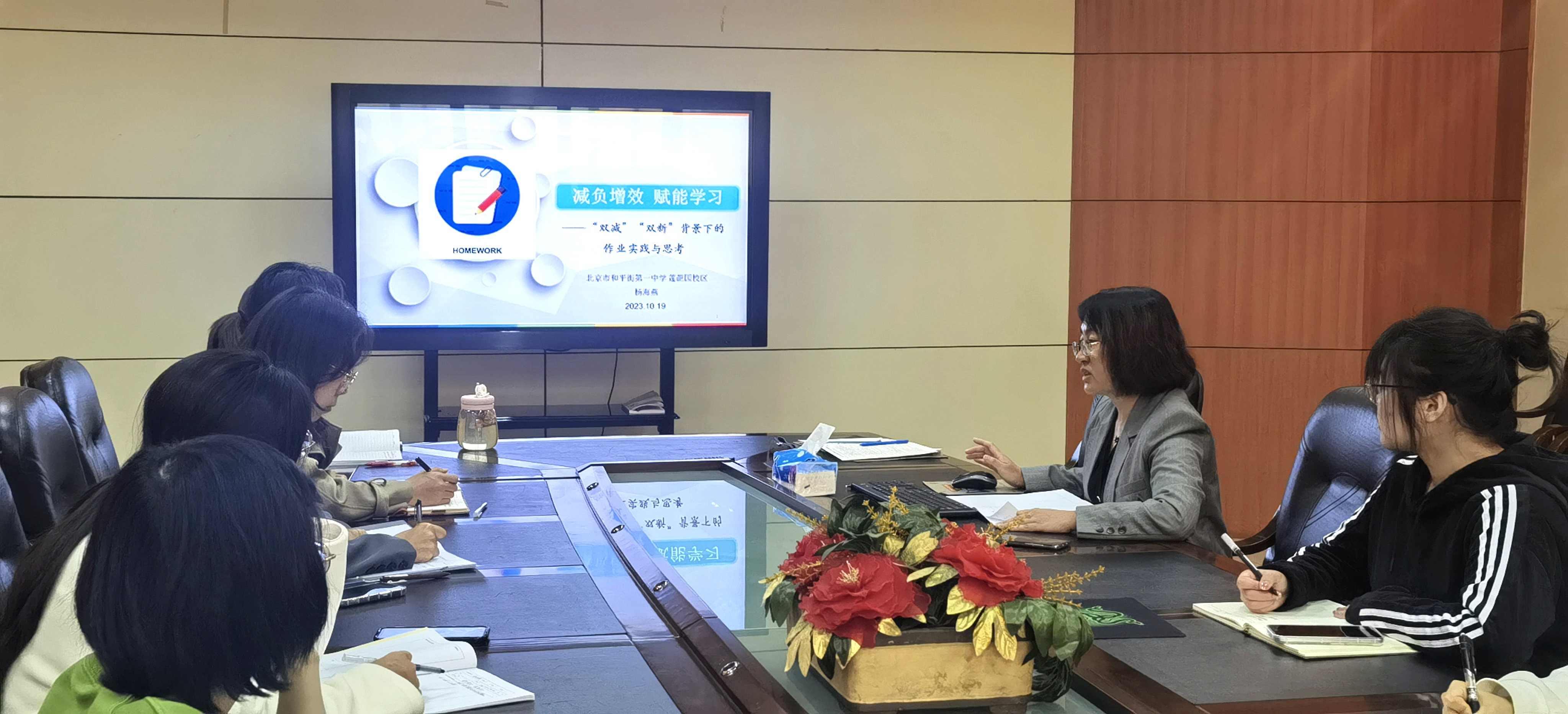 2023年10月19日上午,莲葩园校区召开本学期第3次青年教师培训会,会议由刘堃主任主持,邀请高一政治备课组组长杨海燕老师为青年教师分享在“双减”“双新”背景下的作业实践与思考。
