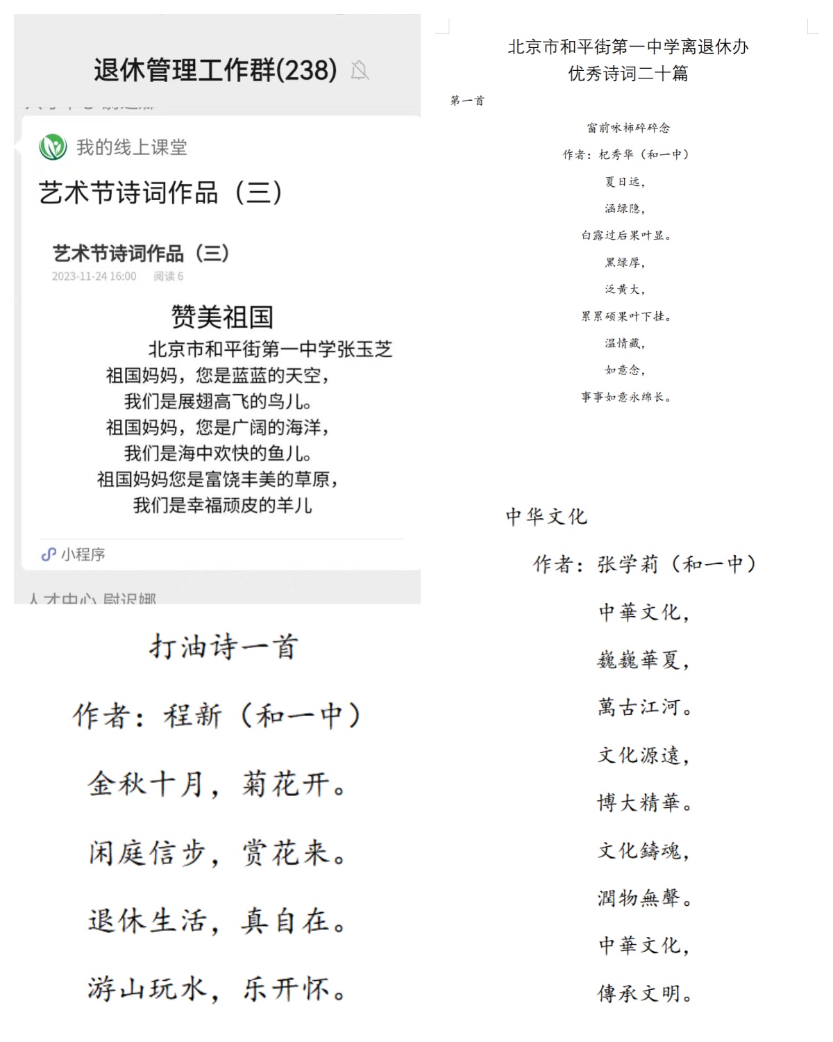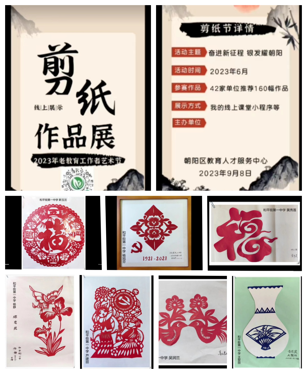 和平街一中离退休办公室组织老教师们积极参加此项活动。活动期间,全体退休教职工共上交书法作品180份、绘画作品200份、剪纸作品220份、摄影作品265份、诗词作品250份、舞蹈作品5份。经评选,推出优秀书法作品3份、优秀绘画作品5份、优秀剪纸作品20份、优秀摄影作品30份、优秀诗词作品20份、优秀舞蹈作品1份,并在区级平台微信小程序“我的线上课堂”和离退休管理工作群进行展示。