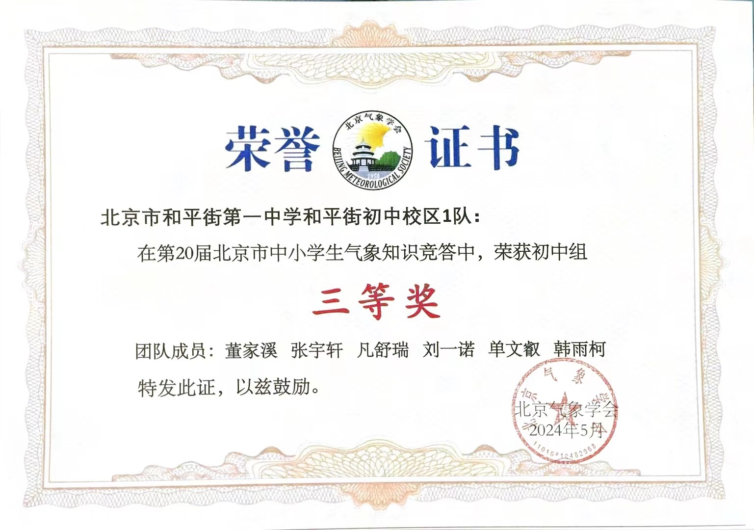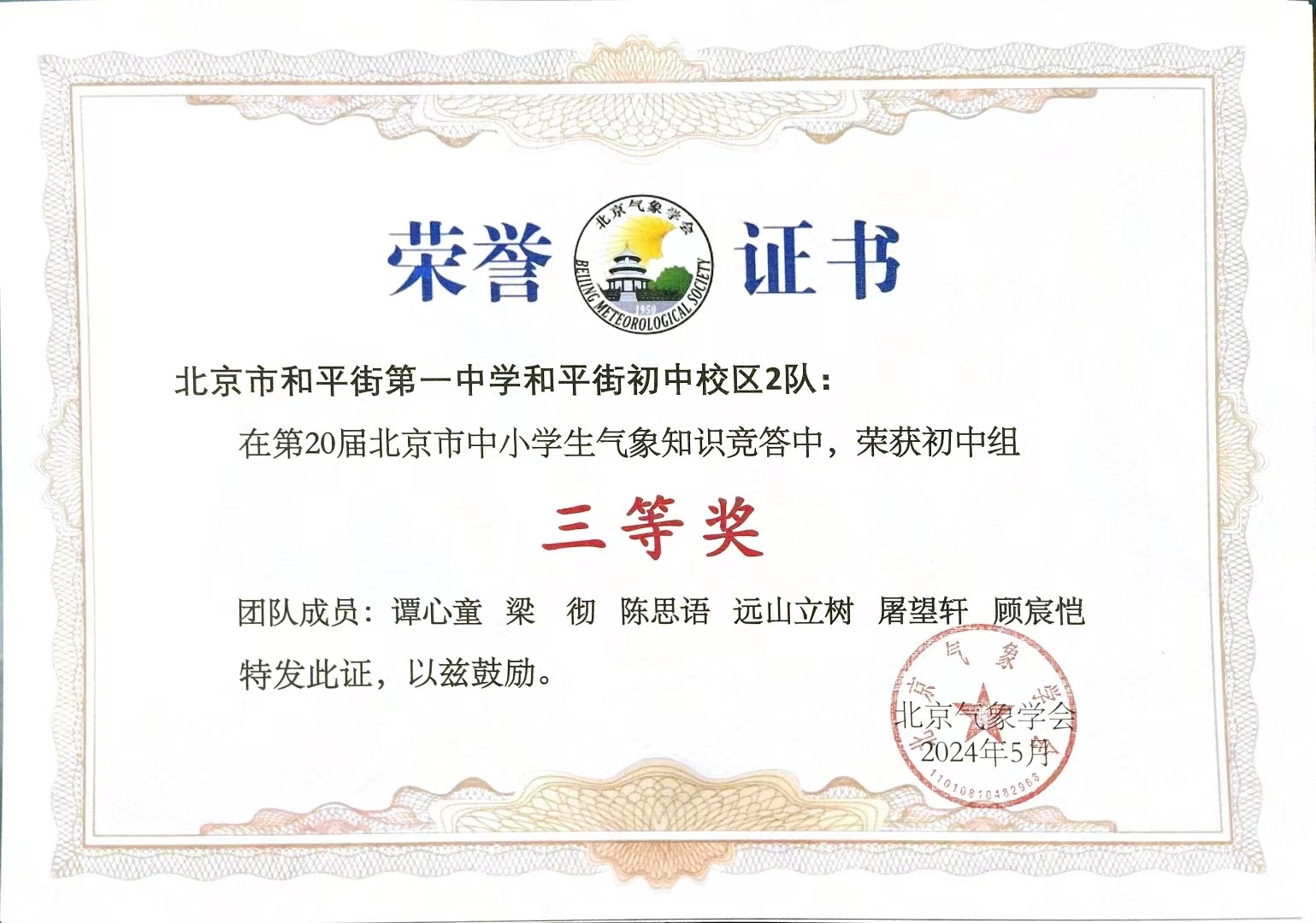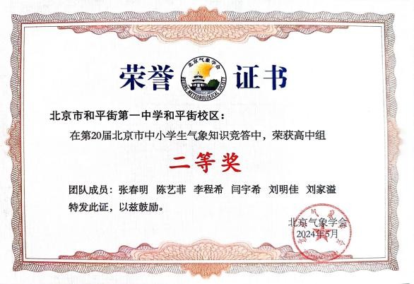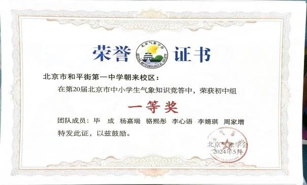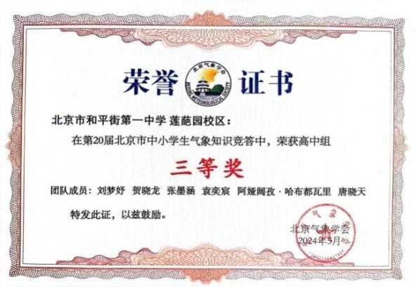 本次活动通过“北京气象科普”小程序进行答题,总赛程历时4天,共有来自北京市的118所学校、2000多名学生参与。经过紧张激烈的线上预赛和决赛答题比拼,我校朝来校区毕成、杨嘉瑞、骆熙彤、李心语、李婧琪、周家増6名同学喜获初中组一等奖,董家溪、张宇轩、凡舒瑞、刘一诺、单文叡、韩雨柯、谭心童、梁彻、陈思语、远山立树、屠望轩、顾宸恺等12名同学喜获初中组三等奖。和平街高中校区张春明、陈艺菲、李程希、闫宇希、刘明佳、刘家溢等6名同学喜获高中组二等奖,莲葩园校区刘梦妤、贺晓龙、张墨涵、袁奕宸、阿娅阔孜·哈布都瓦里和唐晓天6名同学喜获高中组三等奖。学校获优秀组织奖。