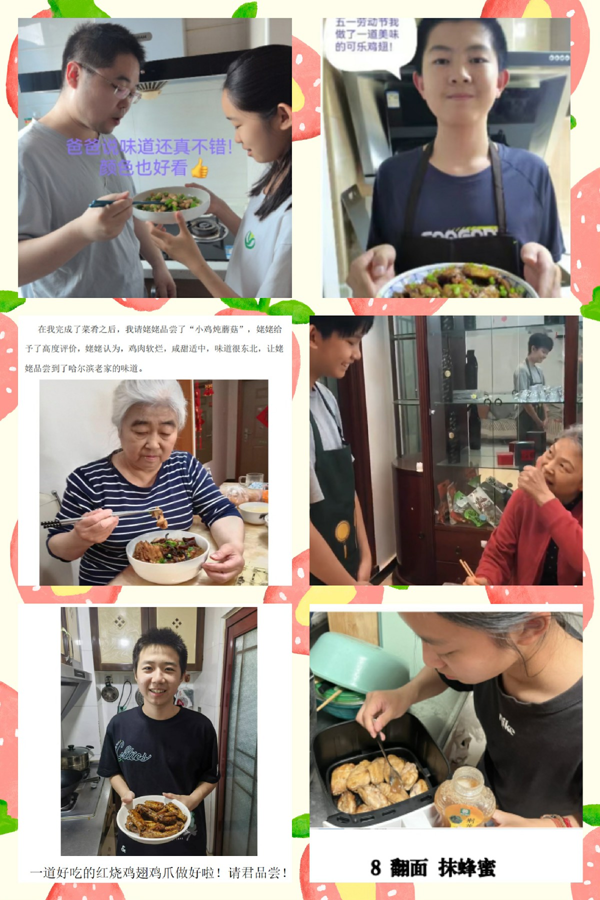 在家庭中,学生发展处利用五一劳动节假期,特别策划了第四届“和一厨神”劳动实践活动。鼓励学生以鸡肉为主材,为家长亲手制作一道家常菜。通过烹饪的过程,学生们深刻体会到家长在日常生活中的辛勤付出,同时也促进了亲子关系的和谐。家长们品尝着孩子们亲手制作的菜肴,脸上洋溢着幸福的笑容。此外,我们还组织学生收看央视五一劳动节晚会,感受劳模们的奉献精神和坚定信念,激发学生们在新时代发扬艰苦奋斗、开拓创新的精神。