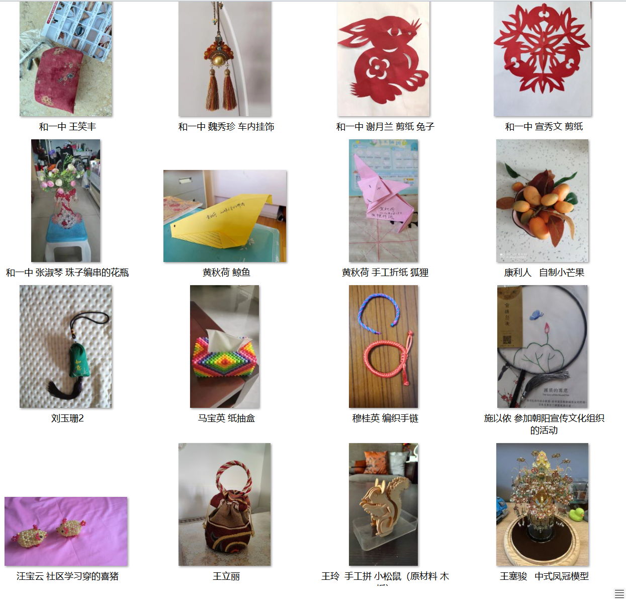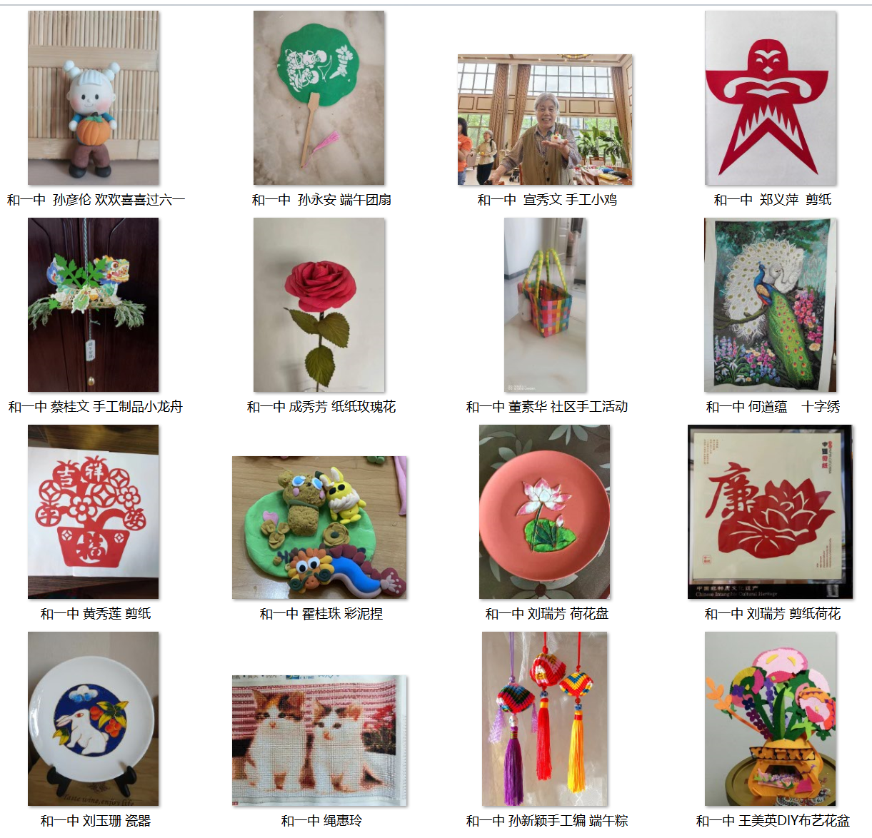 多彩非遗,薪火相传。为让老人们亲身体验中国传统文化的独特魅力与精神内涵,2024年暑期,和平街一中退休办组织离退休老教师开展了一系列丰富多彩的手工活动。本次活动成果丰硕,共收到剪纸作品50份、泥塑作品36件、折纸作品28件、黏土制作20件、拼图贴画18幅以及串珠作品30串。