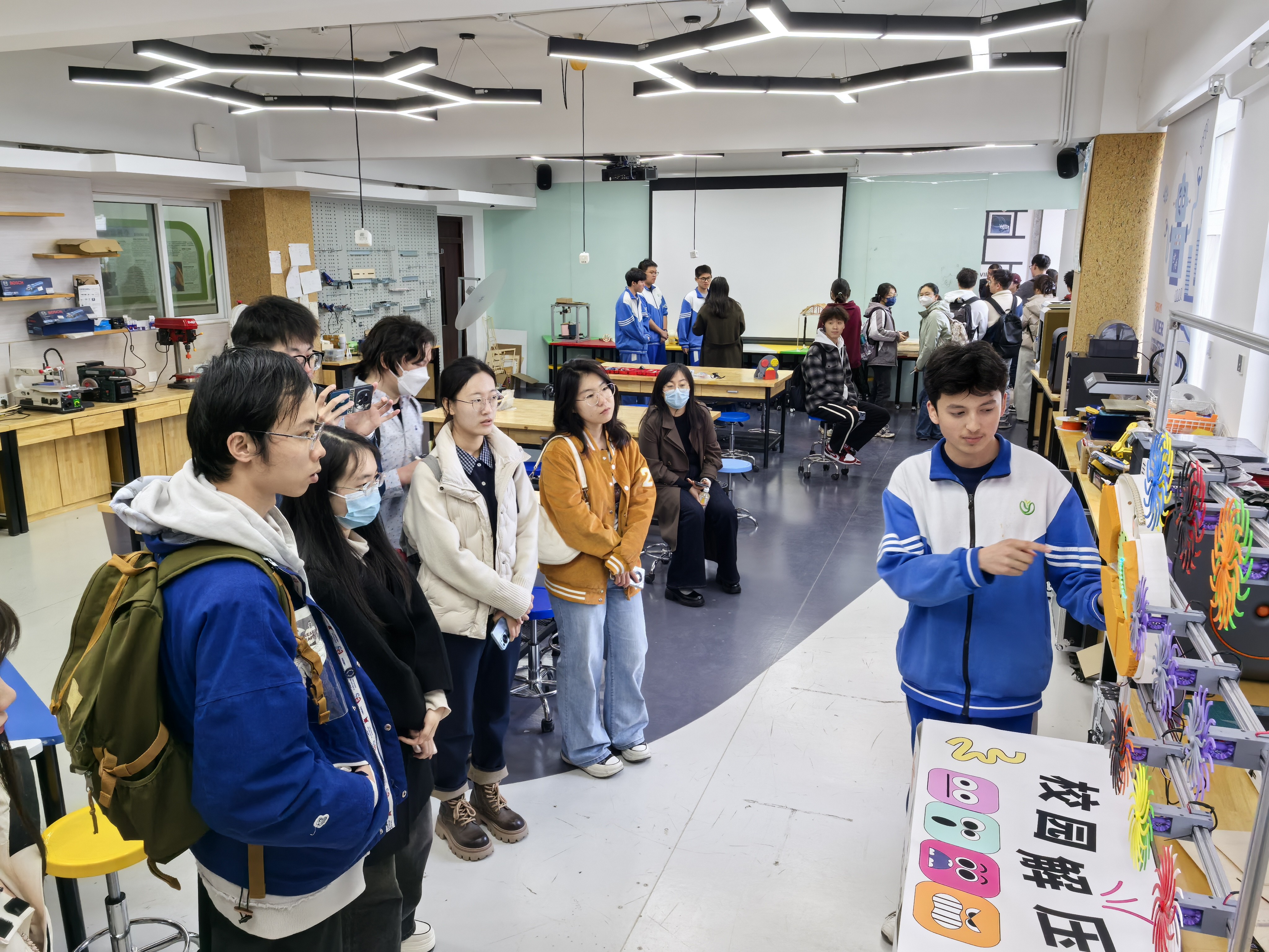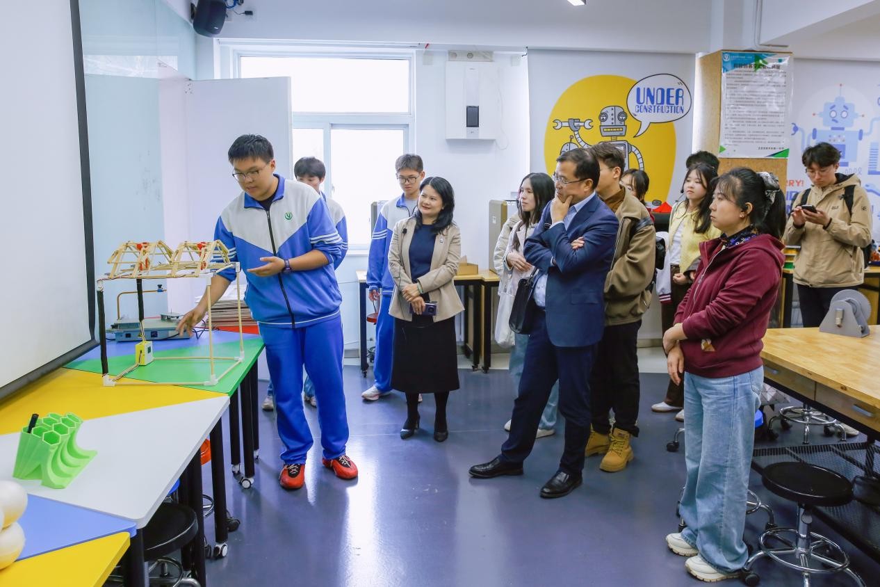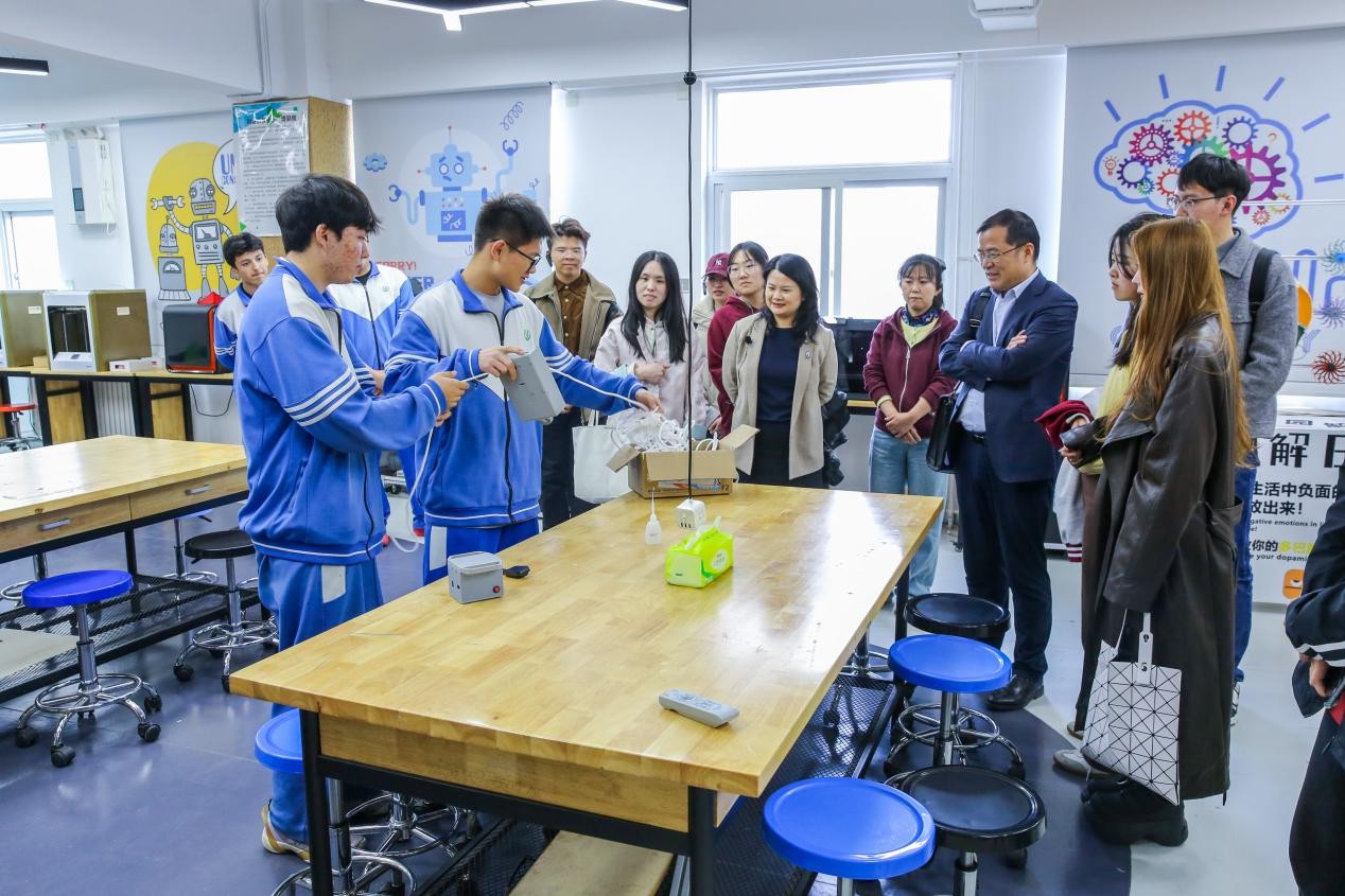 清华大学师生们在北京市和平街第一中学校长杨艳的带领下,依次参观了校园内的书香厅、艺术展廊、创客教室、阳光厅、体育馆、创客教室、汉服制作室、美术教室等,观摩了部分校本课程,并详细了解了学生创新项目的开展情况。学校丰富的校本课程和独特的校园文化给调研师生留下了深刻印象。