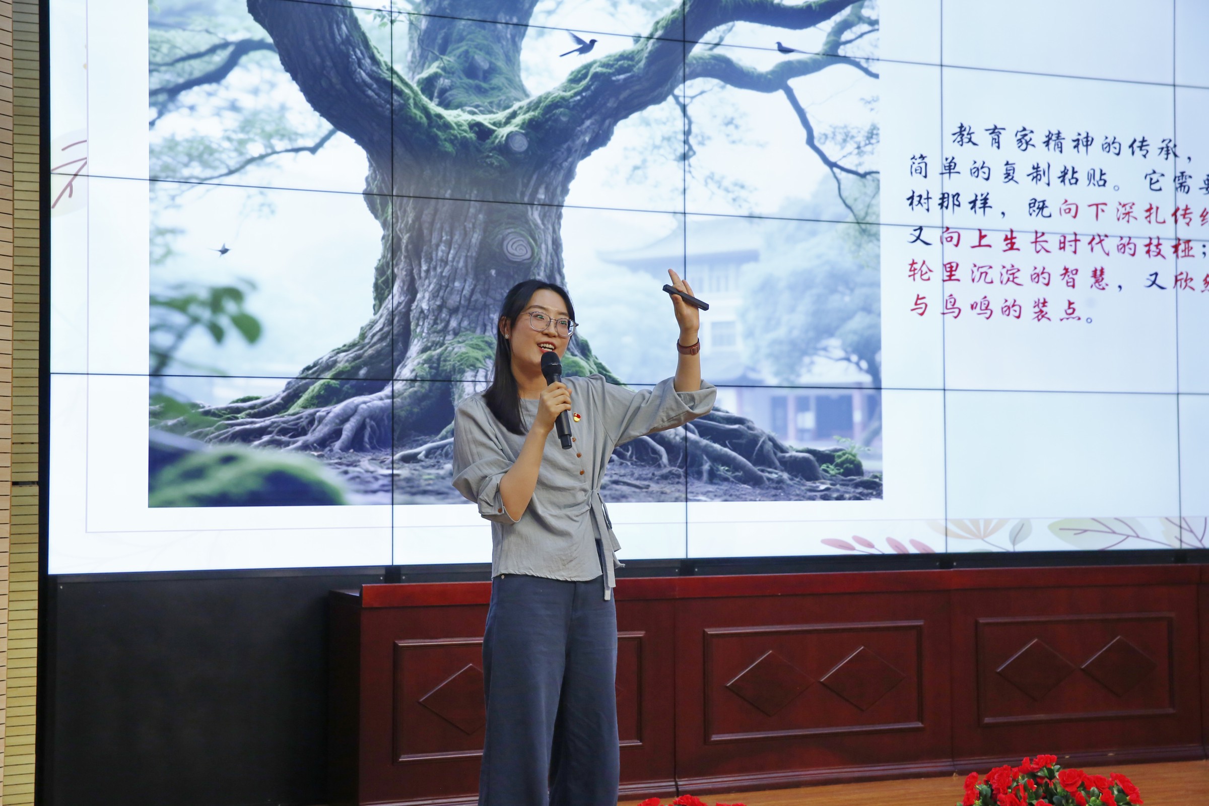 莲葩园校区的闫梦老师以《弘扬师道之光,铸就教育之魂》为题,对师道与教育之魂进行了深入阐述。她的演讲让我们对教育有了更深层次的理解——教育,不仅是知识的传递,更是灵魂的塑造,是教师与学生共同成长的过程。