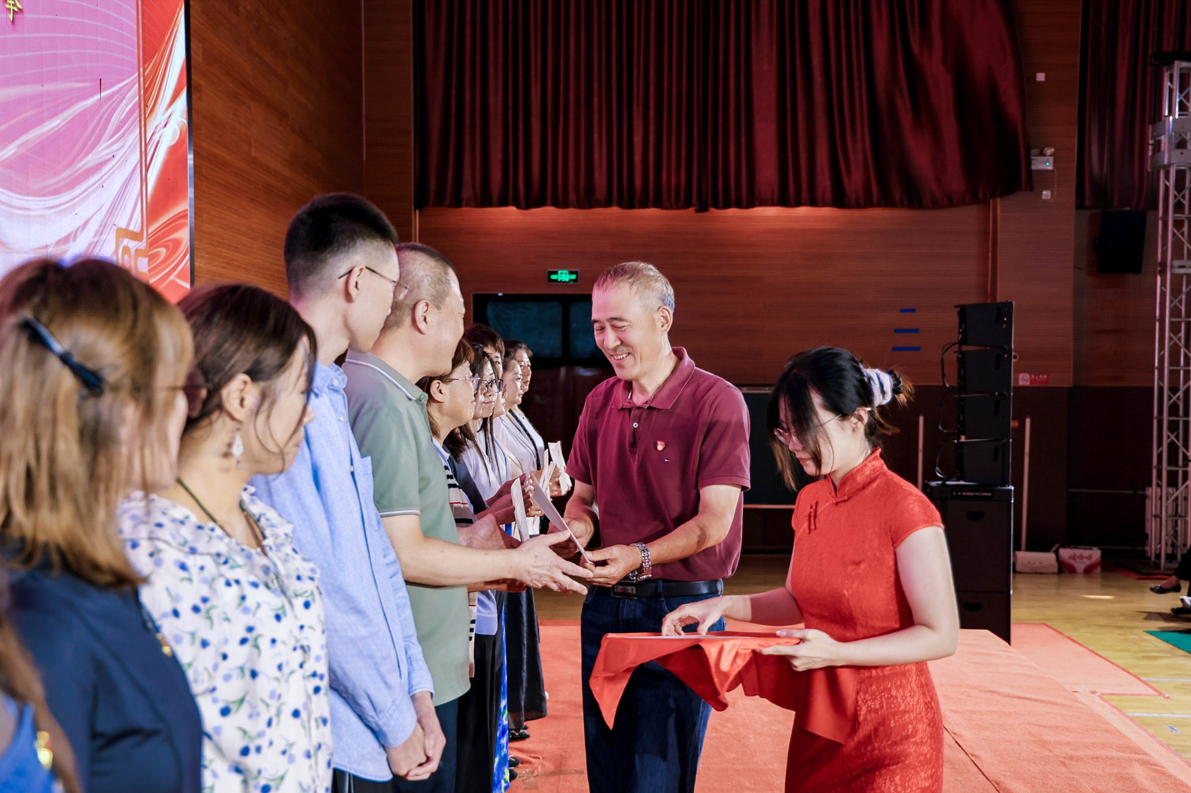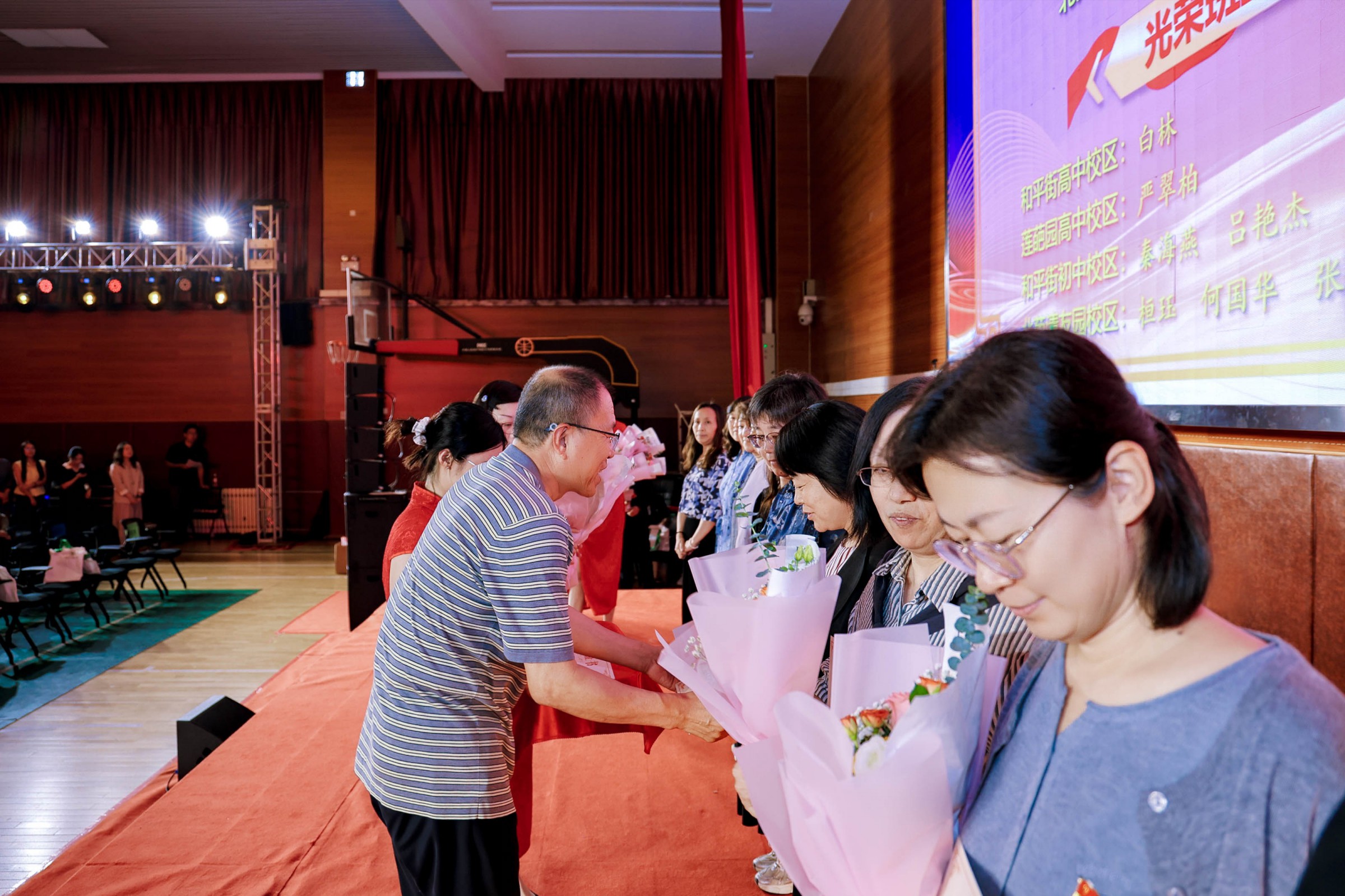 “躬耕篇”则向长期坚守教育岗位的前辈致敬,副校长周建萍在颁奖词中感慨“青丝染尽霜雪色,丹心未改杏坛情”。校长杨艳、书记王松为“光荣从教三十五年特别奖”“光荣班主任三十年特别奖”“光荣班主任二十年特别奖”获得者颁奖,老教师们数十年如一日的坚守与奉献,赢得全场热烈掌声。