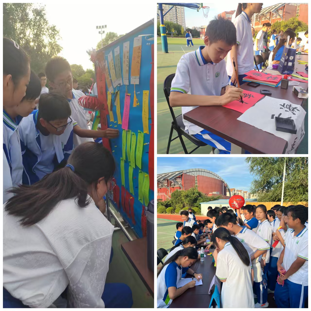 开学初,语文组教师便着手策划,提前两周组织师生筹备。同学们踊跃参与:精心绘制主题海报与宣传条幅;在手抄报中摘录中秋佳句、梳理节日渊源;巧手制作融入“国泰民安”等祝福字样的灯笼;创作的谜语兼顾古典文学与家国情怀,意蕴深厚。“月饼工坊”里,大家认真制作带有传统纹样的月饼;部分同学还悉心准备汉服,深入了解传统服饰文化。