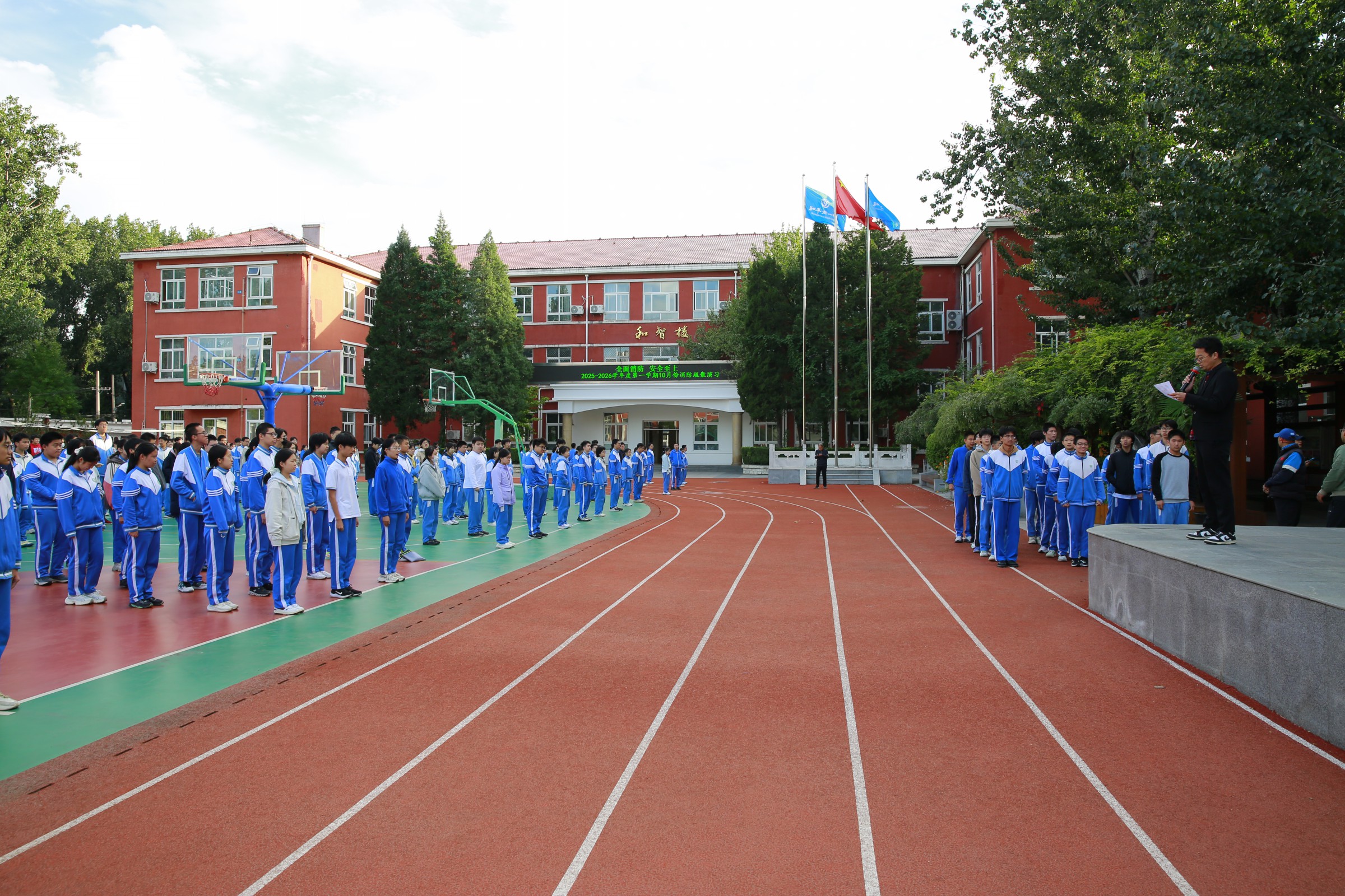 随着紧急疏散信号响起,各岗位教师和课堂上授课教师迅速反应,按照预设疏散路线,有序组织本班学生弯腰、捂鼻,快速向教学楼外撤离;同学们听从指挥,保持安静有序,不推不挤,沿着指定通道迅速抵达操场集合点。到达操场后,各班快速整队,体委逐一清点本班人数,并及时向体育老师汇报。教师队伍则在指定区域集合。整个过程高效有序,充分展现了师生良好的应急素养。