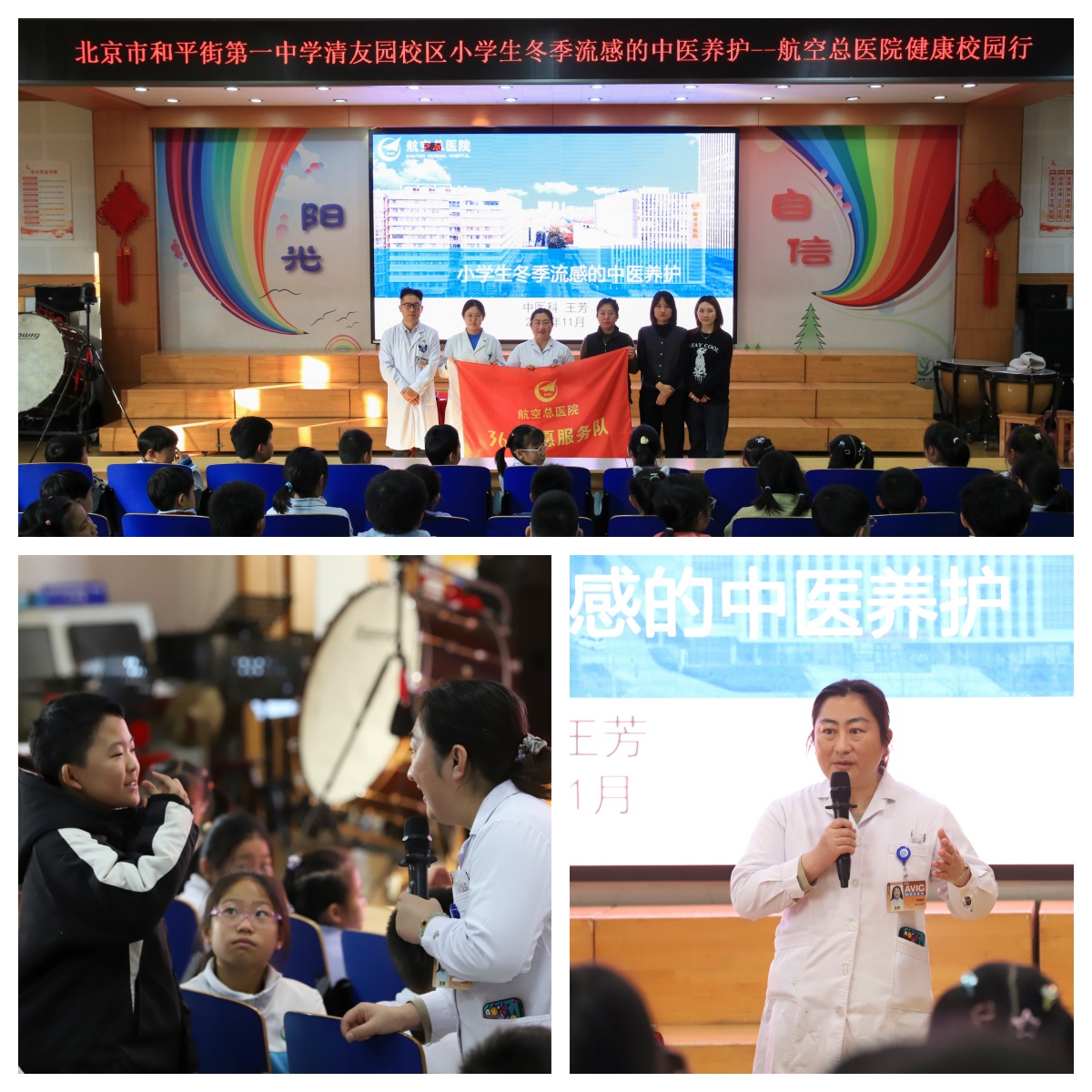 2025年11月3日,航空总医院中医科王芳主任受邀来到清友园校区,开展“健康校园行——冬季流感中医养护”专题讲座。活动由校医姜南老师主持,四年级全体学生通过主会场与分会场同步参与学习。