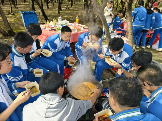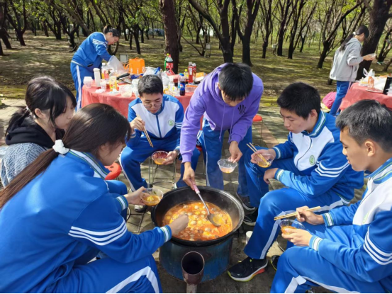 午餐时光更是充满烟火气与幸福感。同学们纷纷拿出提前准备的丰富食材,洗菜、切菜、生火、烹饪有条不紊。热气腾腾的火锅咕嘟作响,香气四溢的羊肉炒饭颗粒分明,精致可口的甜品点缀其间,亲手制作的美食不仅暖胃,更治愈了所有疲惫,让友谊在分享中升温。