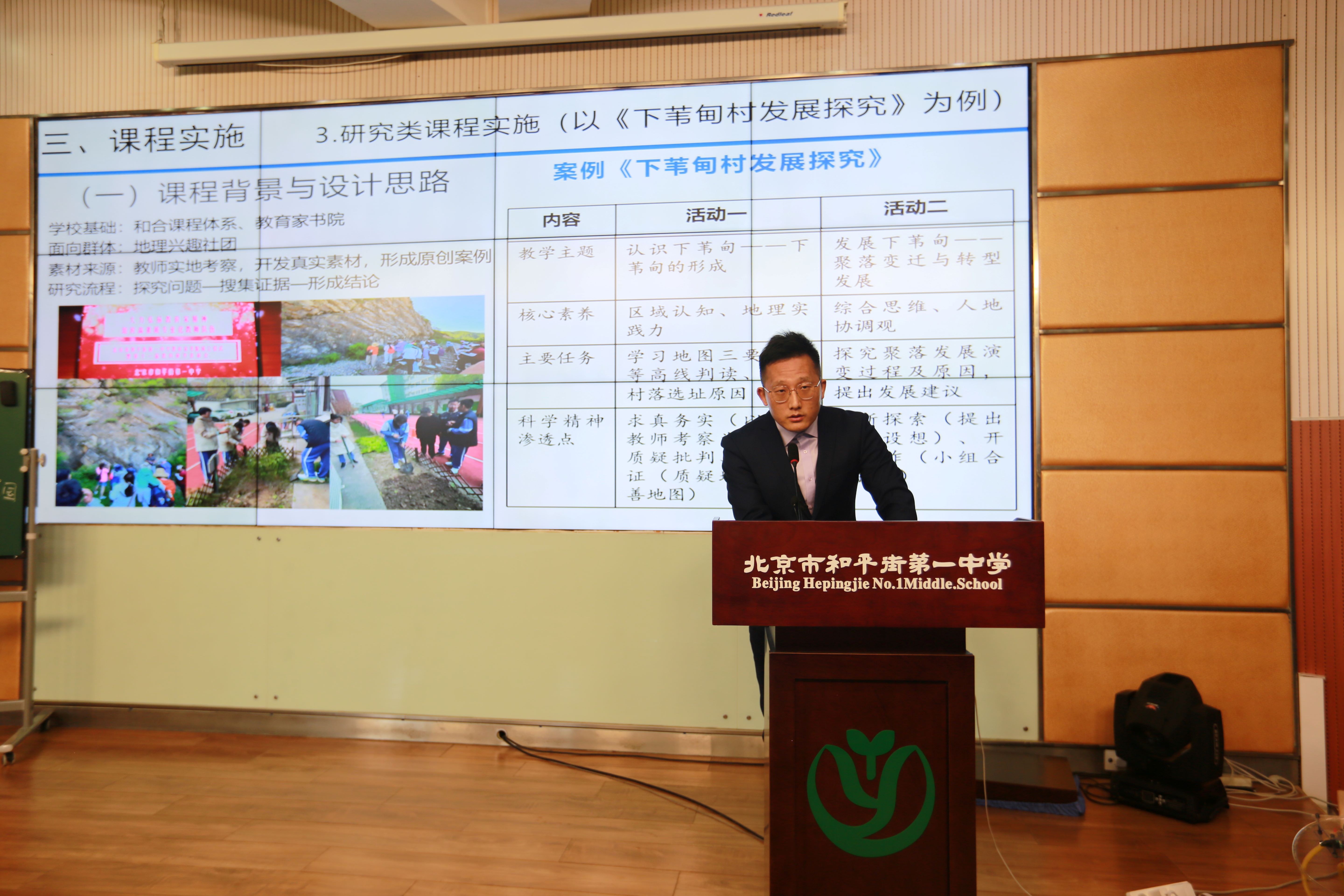 在课程建设交流中,李翠格、王少杰、张国庆、张素芳四位老师系统汇报了学校基于“和合”课程所构建的“基础—拓展—研究”三级地理课程体系。汇报展示了从乡土实践到跨学科融合的课程进阶路径,体现了科学精神在地理教学中的系统性融入。