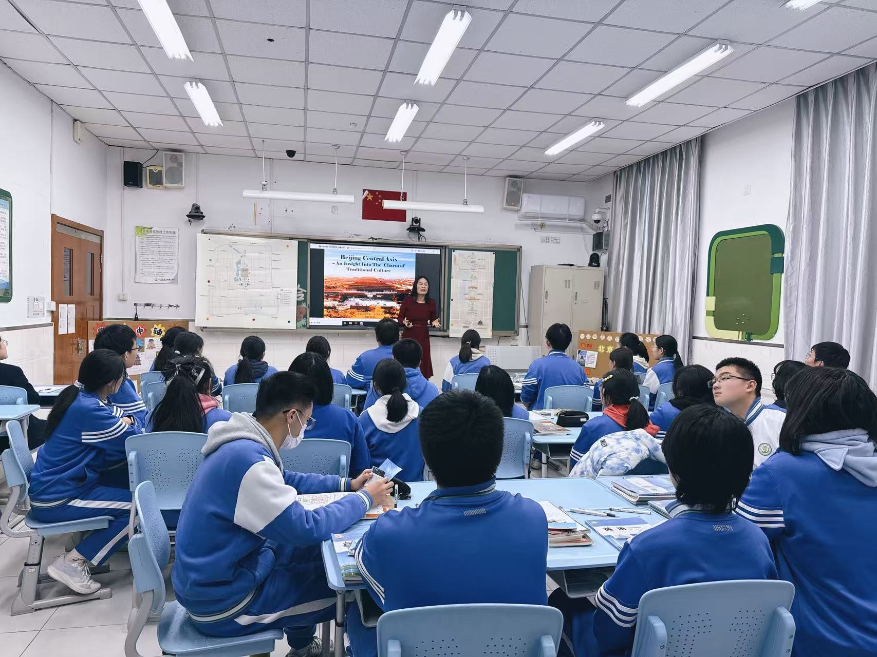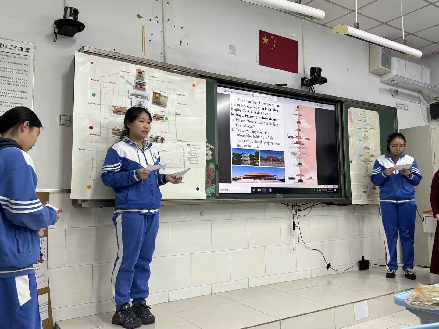 在和平街高中校区,课程以“时空轴线·文明对话”为线索展开。地理教师孙倩引导学生从地理格局与城市功能变迁入手,探究中轴线与北京水系、地形以及古今城市布局的关联;历史教师李喆深入解读轴线蕴含的“中和”礼制思想与中华文明连续性;英语环节则化身为“文化传播工作坊”,教师李风英带领学生用英语策划中轴线主题骑行路线、设计双语解说词,并围绕“如何向世界介绍中轴线”进行小组展示,让学生在实践中提升跨文化讲述能力。