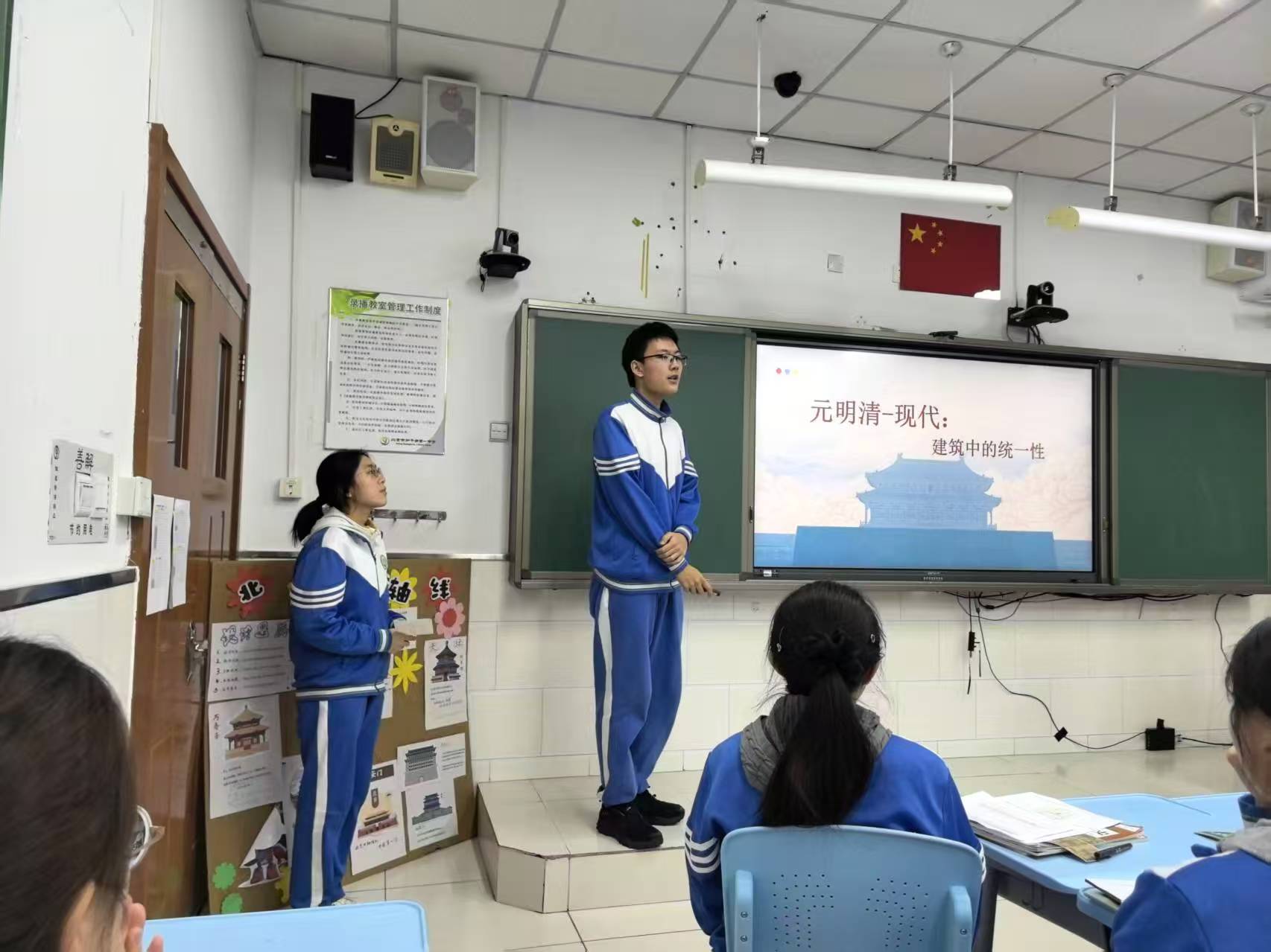 与此同时,莲葩园校区更侧重“解构轴线·联结当代”。课程从“中轴线上的一砖一瓦”讲起,地理教师陈瑶引导学生聚焦建筑材料如琉璃瓦、楠木的来源与运输路线,解读古代“因地制宜”的生态智慧;历史教师郑静舟通过对比元、明、清中轴线格局演变,剖析其承载的国家治理理念变迁;英语教师赵兴星组织学生就“中轴线的现代价值与保护”展开小组合作学习,建构思维框架,推动传统文化与现代生活的创造性联结。