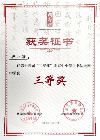 2025年7月,在第十四届“兰亭杯”北京市中小学生书画大赛中,美术社团学子严一漪、杨景昀潜心创作、精准落笔,凭借优质作品脱颖而出,双双荣获三等奖,以笔墨勾勒出文化韵味,彰显了汉字书画的传统魅力。