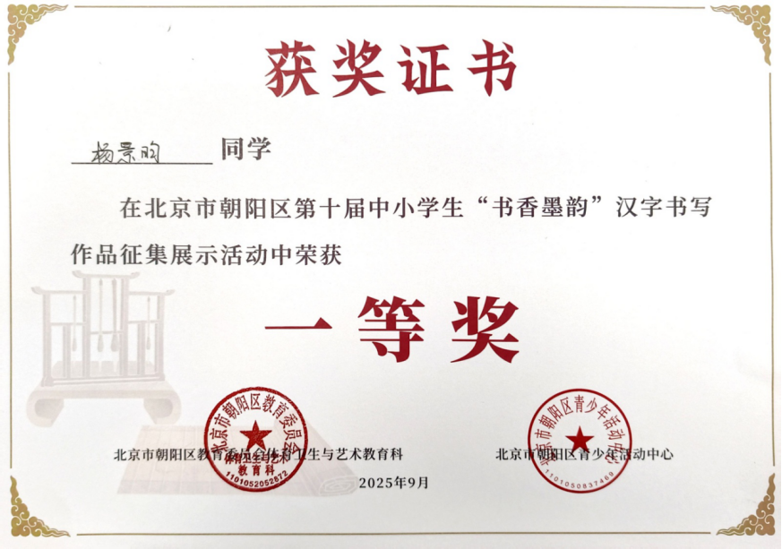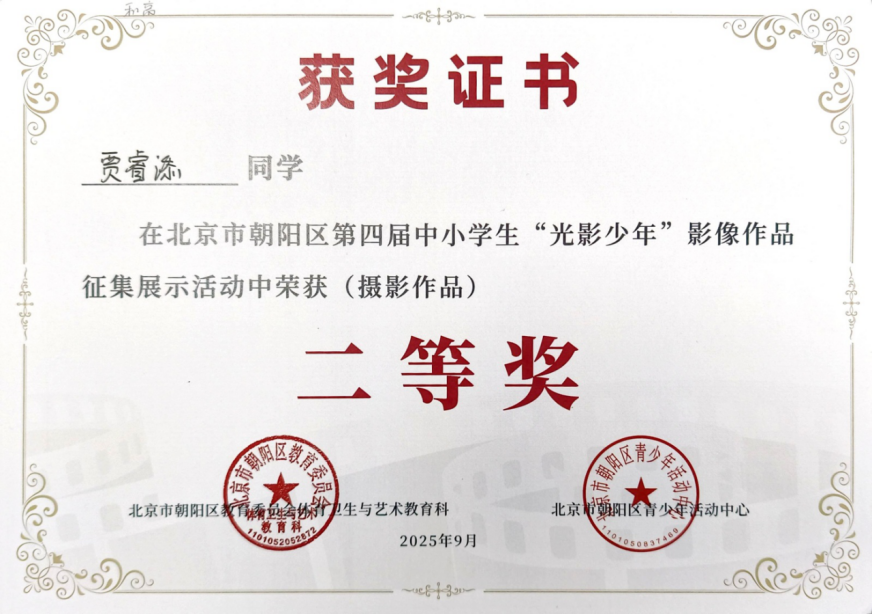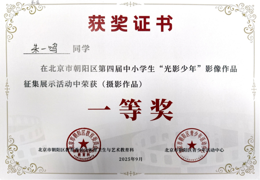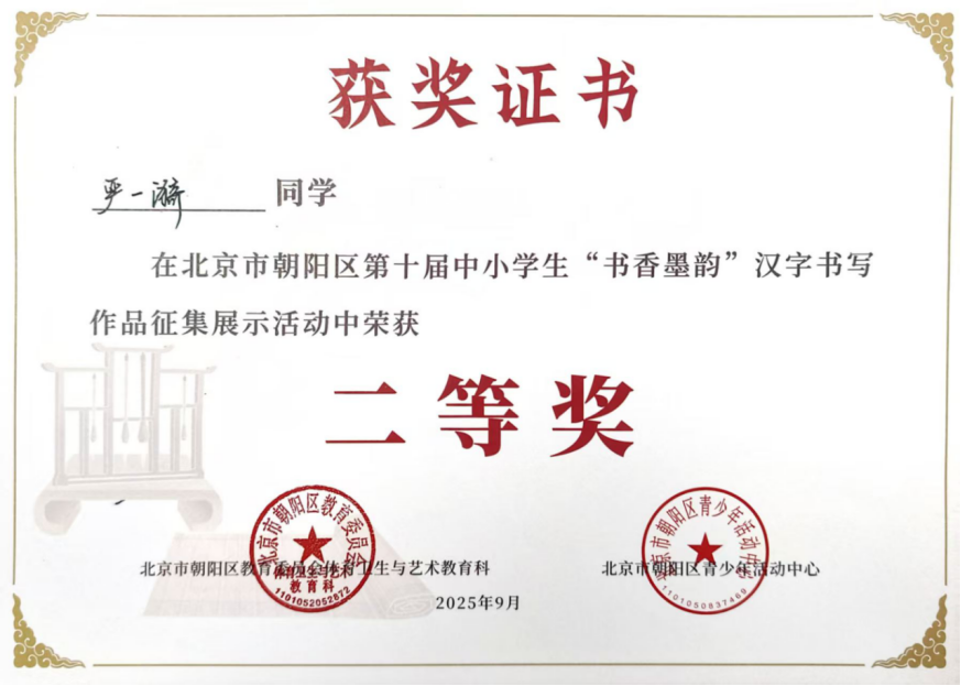 2025年9月,在北京市朝阳区第四届中小学生“光影少年”摄影作品征集活动中,朱一鸣聚焦生活光影,用镜头定格美好瞬间,作品兼具创意与感染力,斩获一等奖;贾睿添深耕摄影创作,精准捕捉场景细节,凭借出色作品荣获二等奖。同期开展的“书香墨韵”汉字书写大赛中,学子们挥毫泼墨,尽显扎实的书写功底:杨景昀字迹工整隽秀,力道匀称,荣获一等奖;严一漪、袁音、曹惠凝笔墨流畅、雅致,均荣获二等奖。在“成长·记录”日记画征集活动中,史晨妮用心记录成长轨迹,其作品细腻生动,荣获三等奖。