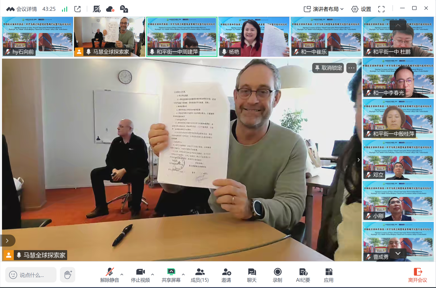 主持人首先介绍了出席嘉宾及活动主题,强调在全球化背景下,两校建立友好合作关系对促进跨文化交流、提升学生全球素养的重要意义。双方学校校领导介绍了学校基本情况、育人理念、学校课程、教学、教师队伍建设以及特色办学情况。北京市和平街第一中学作为北京市市级示范校,是一所集小学、初中、高中十二年于一体的教育集团,为学生全面而个性优长发展提供优质教育。荷兰Trevianum college特雷维亚努姆学校作为荷兰有名的高质量中学,在工程教育、科技、体育等方面特色办学享誉荷兰。双方校领导表达了两校携手共进、深耕教育合作的美好愿景,希望通过多层次交流为两校师生拓宽国际视野,搭建更多国际化交流成长平台。