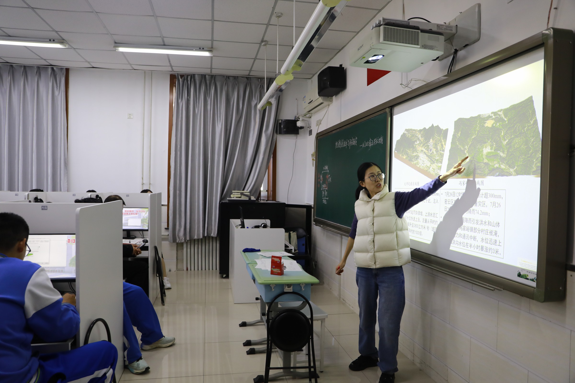 地理李春红老师以《地理信息技术与防灾减灾》为题,选取2025年密云洪水事件创设真实的课堂探究情境,引导学生借助水循环原理分析洪水的成因,利用ArcGIS软件、GEE遥感影像等地理信息技术,体验和模拟河库水位涨落对淹没地区的影响,提升信息技术素养和家国情怀。