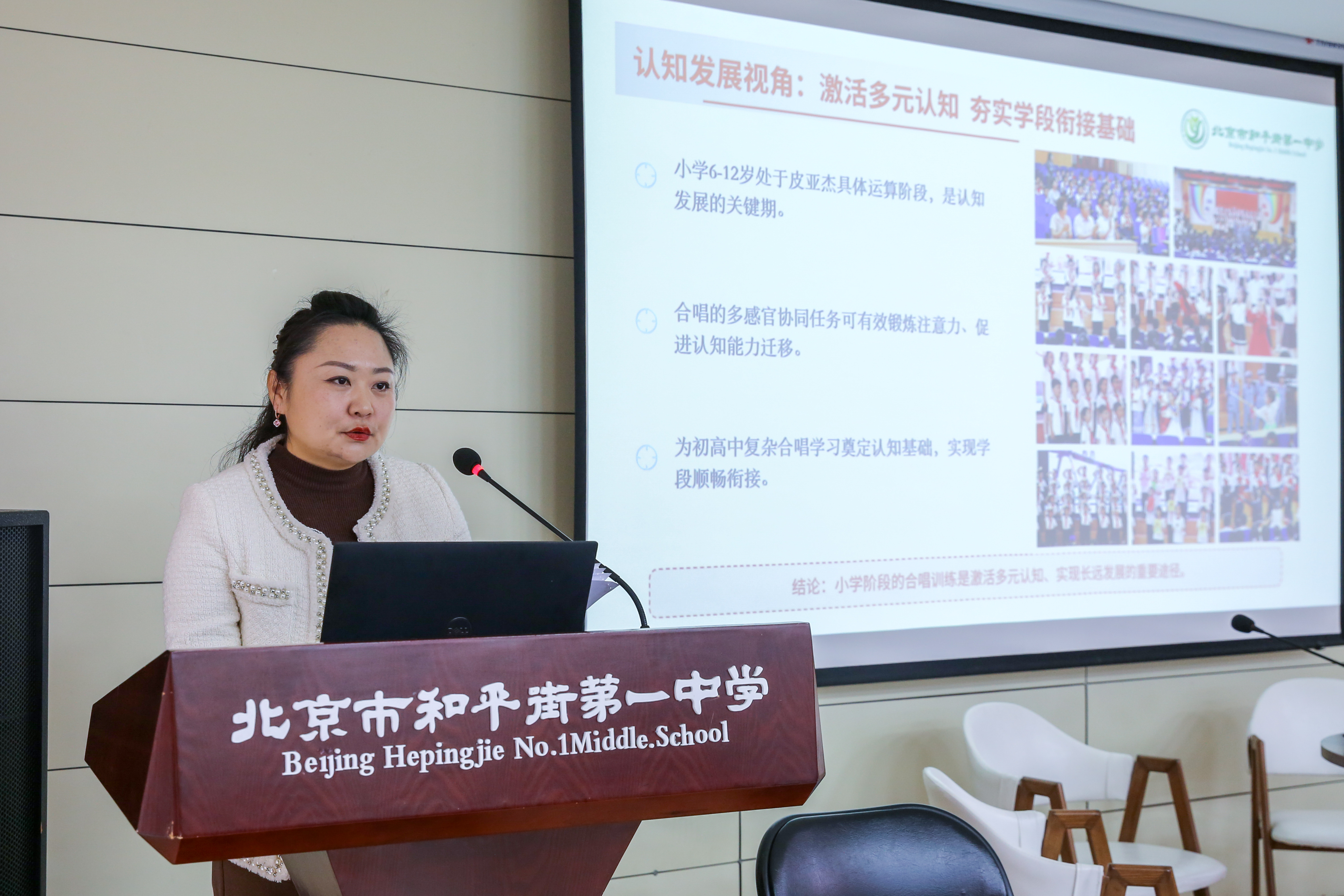 小学部音乐教师张馨文从课题研究角度,做了《童声和韵 乐润成长》的主题发言,汇报了一体化模式下小学合唱能力培养实践研究的成果。