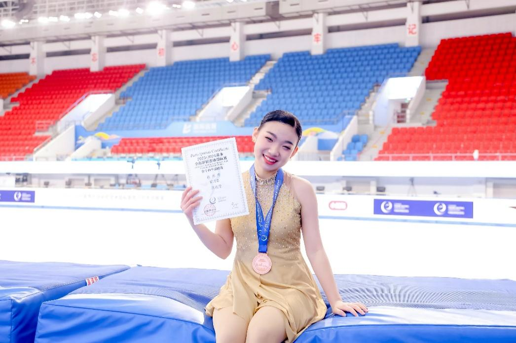 9岁起,焦瑾萱便开始学习花样滑冰和轮滑,两项运动相互滋养——冰上的精准控制让她在轮滑时更具稳定性,而轮滑的灵活节奏也为她的冰上表演增添了独特韵律。2023年,她在全国花样滑冰锦标赛队列滑项目中获得铜牌,成功斩获“运动健将”称号;2025年,她代表中国队参加世界花样轮滑锦标赛混合队列比赛,取得世界第五的好成绩,并成功荣膺“国际运动健将”称号。