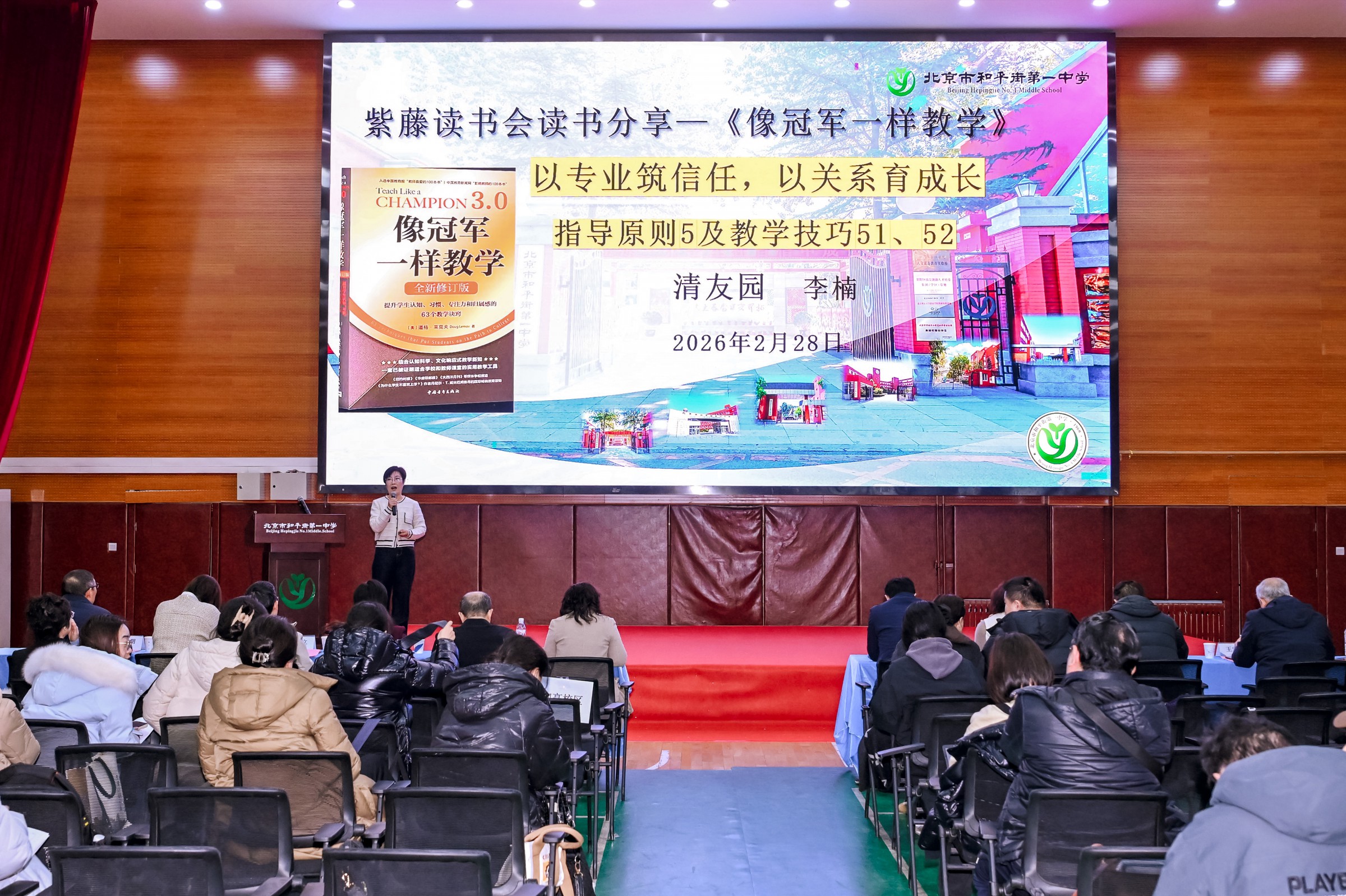会议第三项,“和一紫藤读书会”读书分享环节,分别来自杨艳校长工作室、“紫藤花开”青年教师成长营以及班主任队伍的教师代表林殿吉老师、李西龙老师和李楠老师,围绕《像冠军一样教学》《教学设计原理》两本书展开分享。林殿吉老师聚焦教学事件,理论与实践结合,分享了课堂实践中的策略与思考;李西龙老师结合罗伯特·加涅的教学设计理念,阐述了其对教学工作的启示;李楠老师结合师生关系,分享了将书中理念转化为教学实践的心路历程,展现了做一名有温度有专业度教师的实践追求。三位教师的分享充分彰显了学校教师勤于学习、乐于思考的良好学风。2025年,自“和一紫藤读书会”成立以来,集团校长办公会领衔推进各校区、各教研组、年级组读书活动,各学习团队全年共读50本书籍,学习型组织建设熠熠生辉。